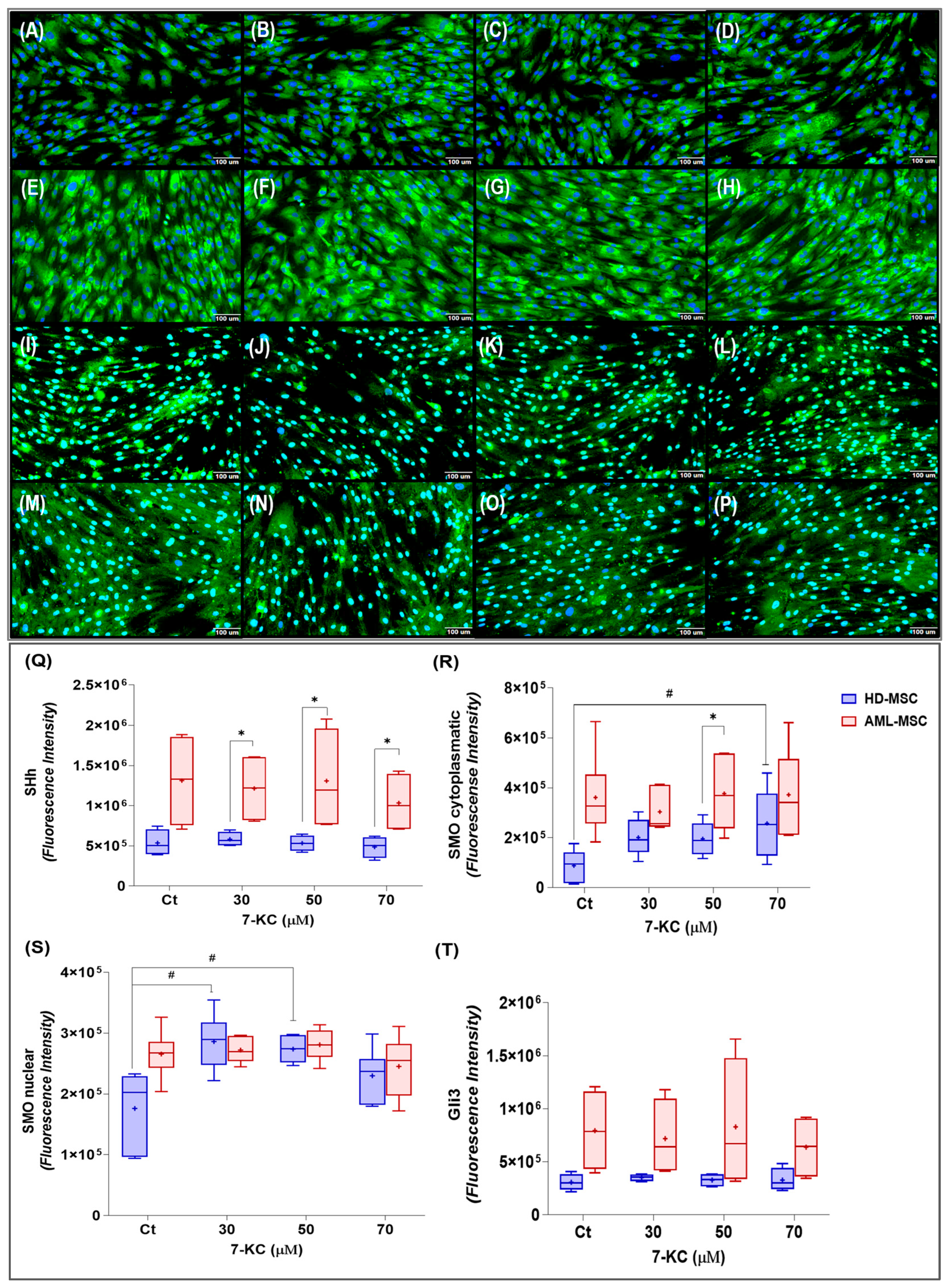 102]. Our findings are consistent with a model in which 7-KC influences SHH/SMO signaling in MSCs, particularly in HD-MSCs. This adds a niche-related dimension and suggests the engagement of lipid stress adaptation programs. In AML-MSCs, the pathway appears to operate at a higher basal level, with a reduced dynamic range for further modulation.