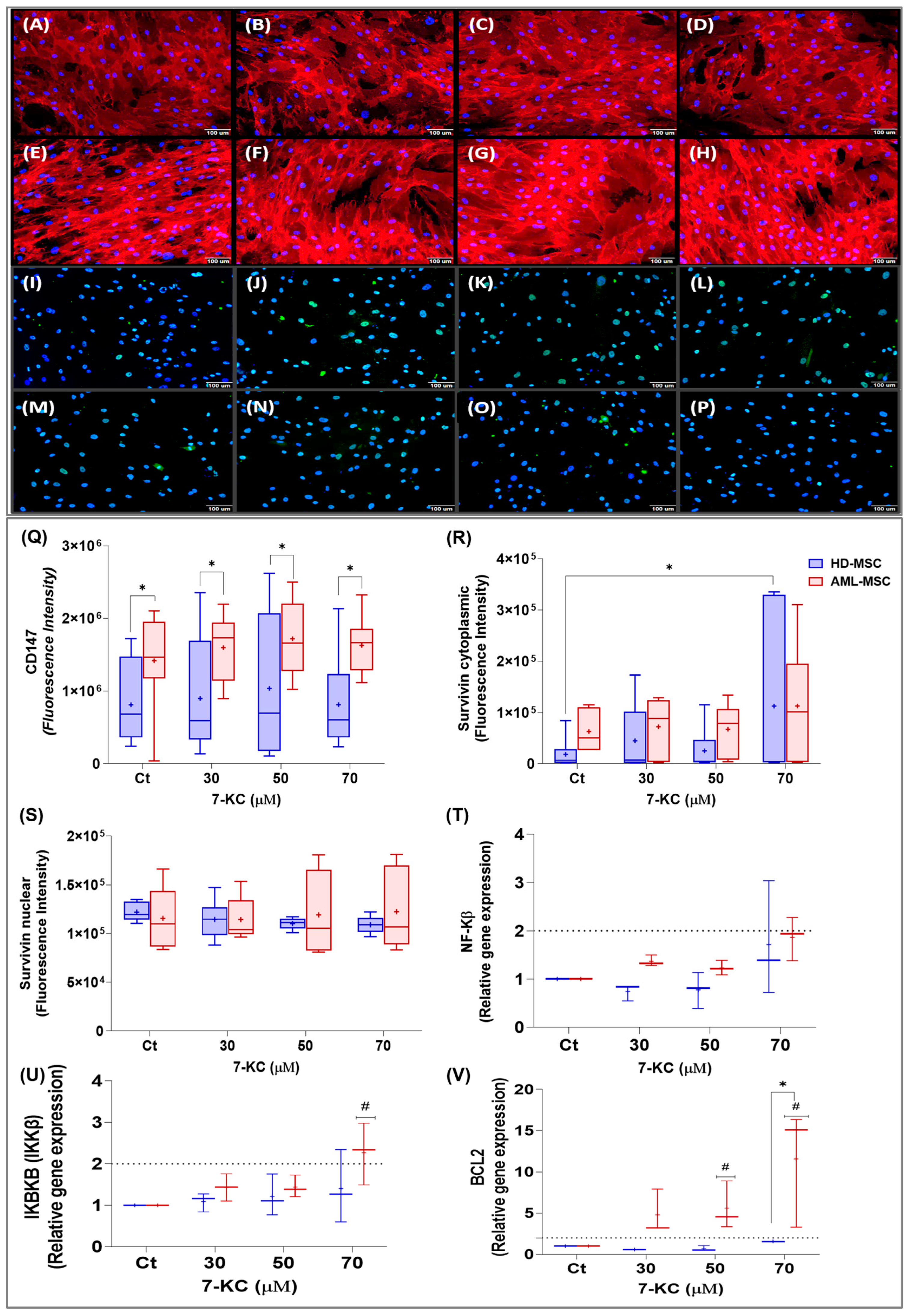 104]. Survivin showed a distinct pattern: It increased in the cytoplasmic compartment of HD-MSCs at higher 7-KC concentrations, whereas AML-MSCs maintained elevated basal levels, consistent with a pro-survival phenotype [