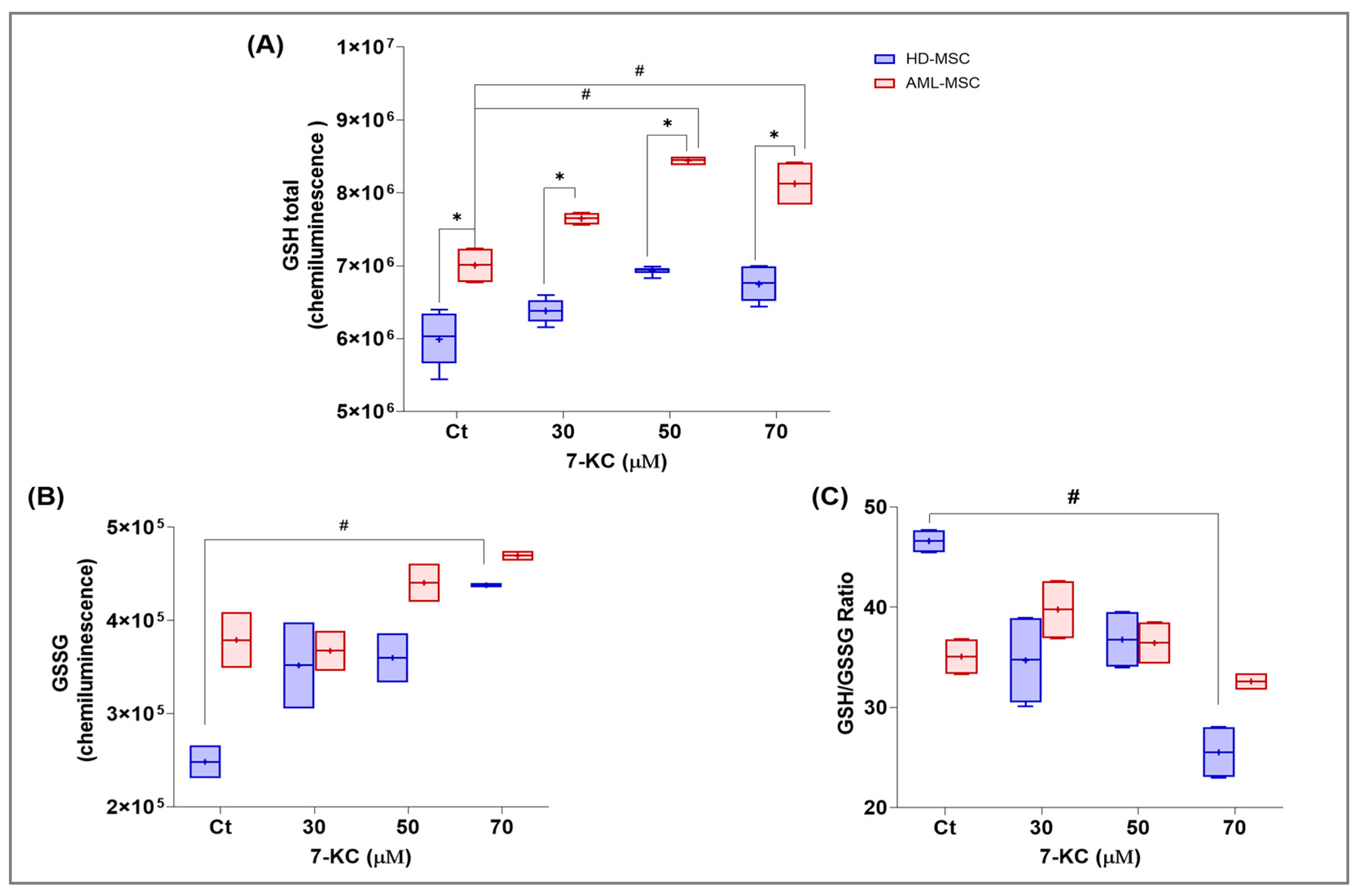 112]. In our study, 7-KC induced distinct redox remodeling in HD-MSCs and AML-MSCs. In AML-MSCs, 7-KC primarily increased total GSH, expanding the glutathione pool and suggesting reinforced buffering capacity. By contrast, HD-MSCs exposed to higher concentrations showed a more pronounced increase in GSSG and a decrease in the GSH/GSSG ratio, consistent with an alteration toward a more oxidized state. Together, these patterns suggest that AML-MSCs may better control 7-KC-induced oxidative stress through glutathione-dependent mechanisms, whereas HD-MSCs tend to accumulate greater redox imbalance at higher 7-KC doses. Accordingly, we next assessed the impact of 7-KC on mitochondrial parameters.