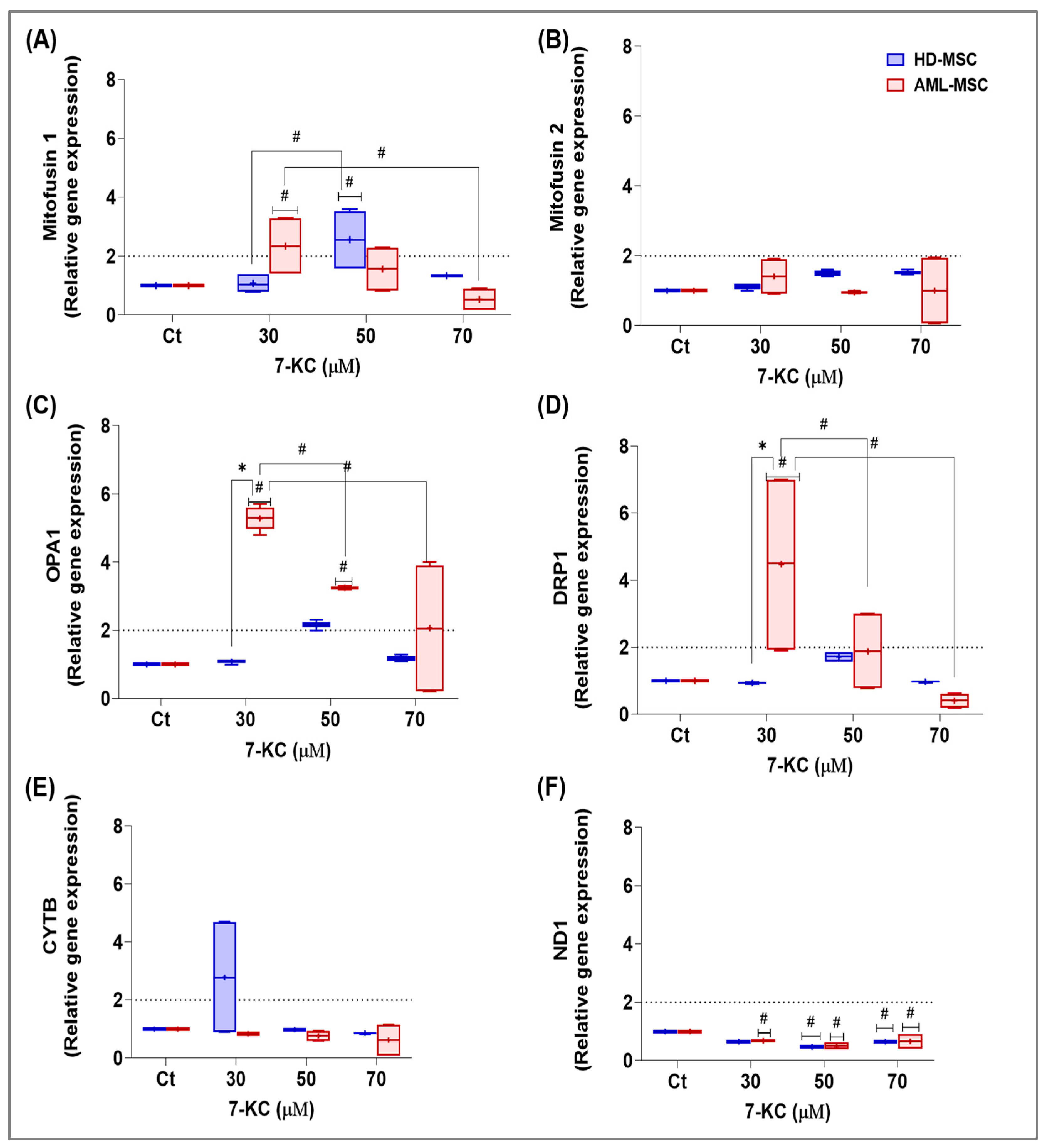 Mitochondrial dynamics were also reshaped by 7-KC, with lineage- and concentration-dependent modulation of fusion–fission genes, including MFN1, MFN2, OPA1, and DRP1. MFN1 and DRP1 were modulated in both lineages, whereas OPA1 increased more prominently in AML-MSCs at intermediate concentrations, consistent with an adaptive program that helps preserve mitochondrial network integrity and connectivity under stress. Accordingly, in AML-MSCs, the combination of elevated TMRE at intermediate doses, changes in OPA1 and DRP1, and the maintenance or upregulation of pro-survival markers such as BCL2 is compatible with tolerance-oriented mitochondrial remodeling that can buffer oxysterol-induced damage [