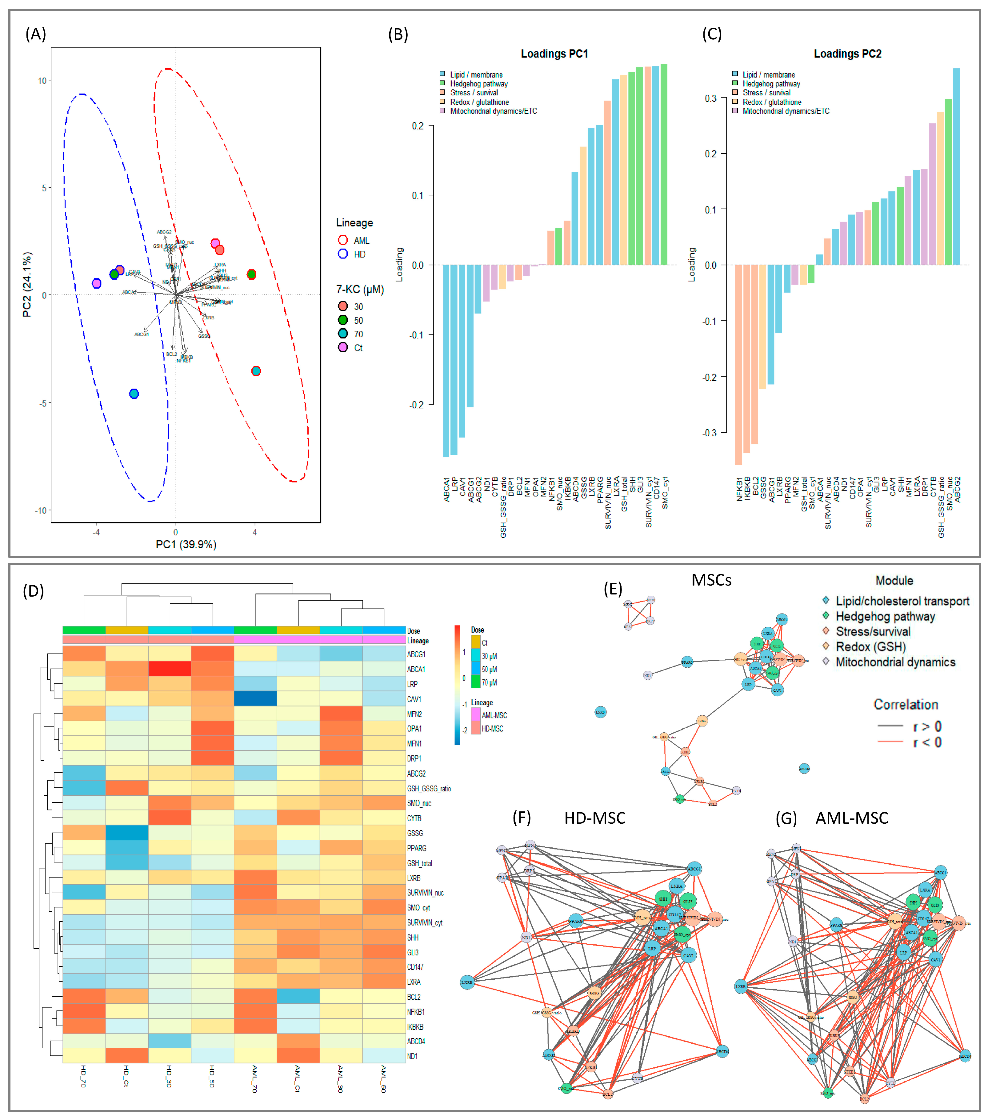 The PCA demonstrated a clear separation between HD-MSCs and AML-MSCs, indicating that 7-KC reprograms integrated cellular markers in a lineage-dependent manner. PC1 primarily reflected a contrast between a lipid-regulation and membrane microdomain axis and a set of Hedgehog- and stress–survival-associated features, coupled to changes in glutathione parameters. PC2 captured an additional dimension dominated by stress–survival and redox–mitochondrial signatures, suggesting that the 7-KC response is organized into modules that are partially orthogonal to the lipid axis. Consistently, the heatmap and hierarchical clustering showed that conditions segregated mainly by lineage and, secondarily, by dose. Correlation networks further supported connectivity among lipid/caveolar, Hedgehog, and stress–survival/redox modules, with a higher density of pro-survival interactions in AML-MSCs.