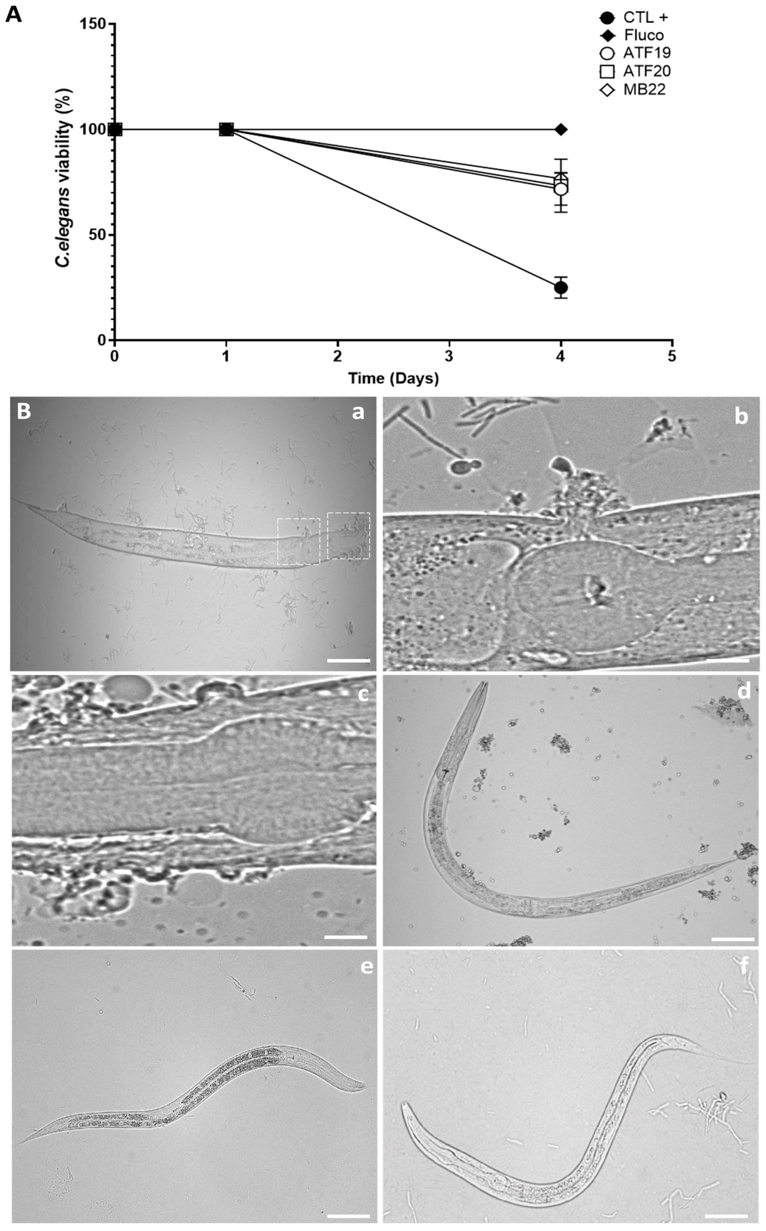 - Okoli, I.; Coleman, J.J.; Tampakakis, E.; An, W.F.; Holson, E.; Wagner, F.; Conery, A.L.; Larkins-Ford, J.; Wu, G.; Stern, A.; et al. Identification of antifungal compounds active against Candida albicans using an improved high-throughput Caenorhabditis elegans assay. PLoS ONE 2009, 4, e7025, Correction in PLoS ONE 2010, 5. [Google Scholar] [CrossRef]