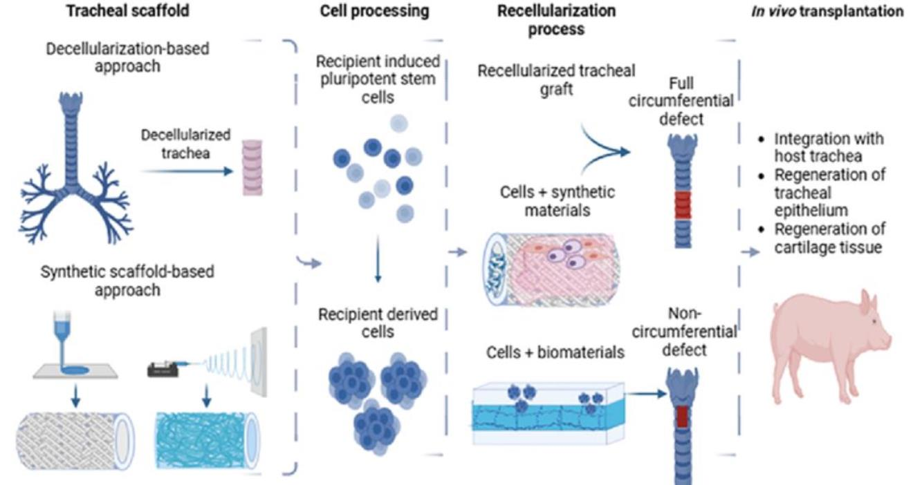 | Partially decellularized tracheal scaff- old (porcine trachea) | Circumferential tracheal graft (~5 cm) | No cells | Partially decellularized tracheal segments were implanted in a porcine model and evaluated by bronchoscopy, imaging, and histology at day 28 and day 56 post- implantation to assess biointegration. | The scaffold showed progressive biointegration with neovascularization, fibroblast colonization of the scaffold, no infection or tissue necrosis and no significant graft rejection at day 28. However, cartilage regeneration remained limited and structural integrity was not fully restored at day 56 | [76] |