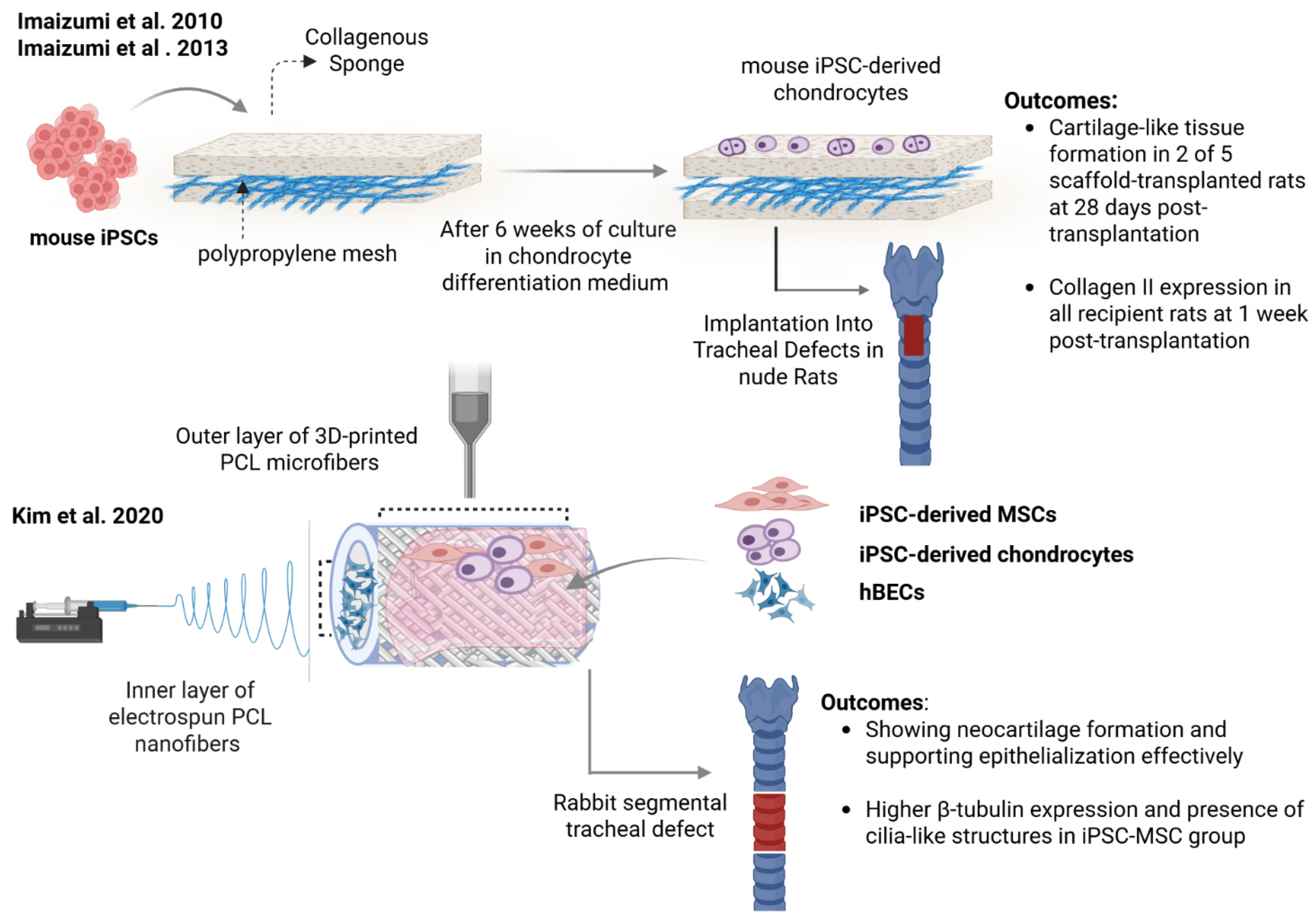 | Polypropylene mesh and collagen sponge | Patch 12 mm in diameter | Mouse iPSCs-derived epithelial cells | 5-day-old iPSCs-derived embryoid bodies (EBs) were cultured at ALI model for 28 days. EBs containing ciliated-like structures were loaded on collagen-coated artificial tracheal graft followed by orthotopic transplantation into nude rats. | Effective coverage of artificial material with differentiated epithelium with γ-tubulin expression on the basal sides of ciliated cells after 7 days. Only 50% of nude rats used for the experiment showed iPSCs-derived tissues. | [77] |