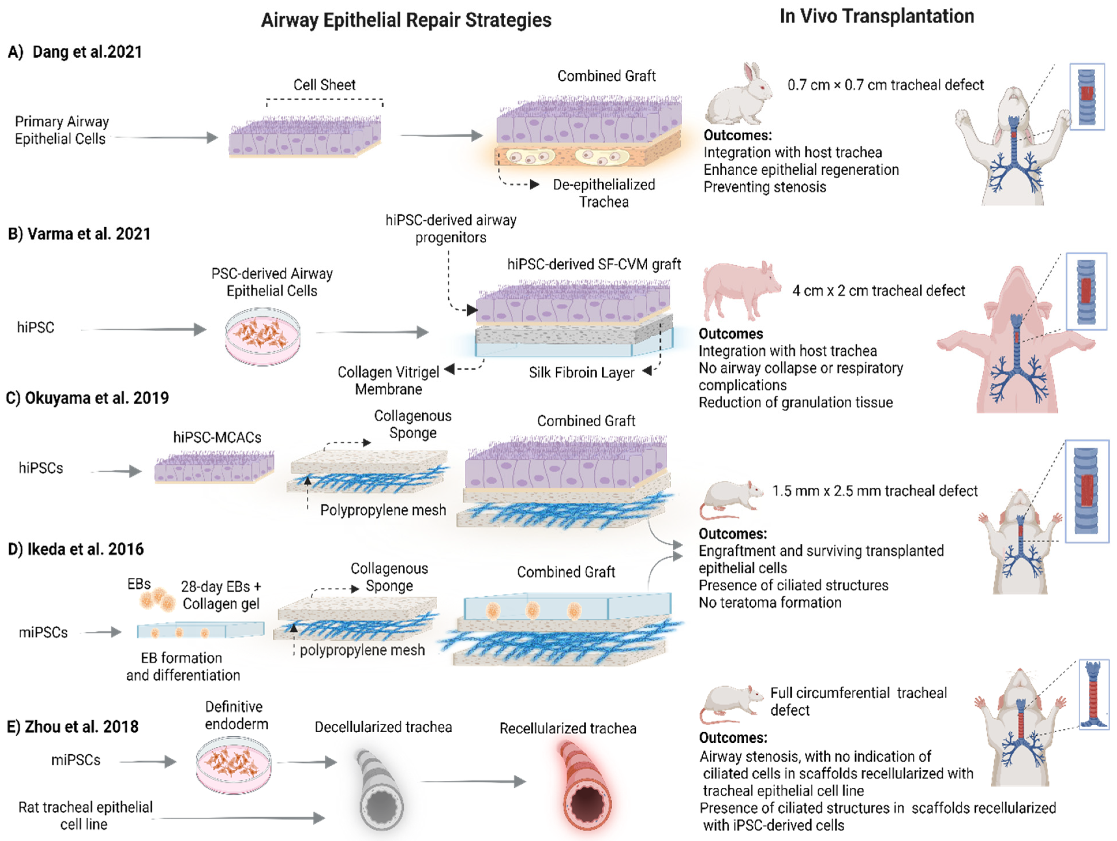 | Silk fibroin and collagen vitrigel membrane (SF-CVM) | Patch 2.5 cm in diameter | Human iPSC-derived airway epithelial cells | Fabricated SF-CVM was glued onto trans-well inserts using fibrin glue, rehydrated and seeded with airway progenitors. Subsequent culture in ALI achieved functional mucociliary epithelia. hiPSC-derived SF-CVM grafts were evaluated in ex vivo and in porcine tracheal defects. | Differentiation of mucociliary epithelium was achieved on SF-CVM graft after 3 days. Integration with host tracheal tissue was observed as well as no airway collapse. SF-CVM graft was covered with hiPSC-derived p.seudostratified epithelium (~80%) on day 3 with reduction in granulation tissue formation. | [25] |