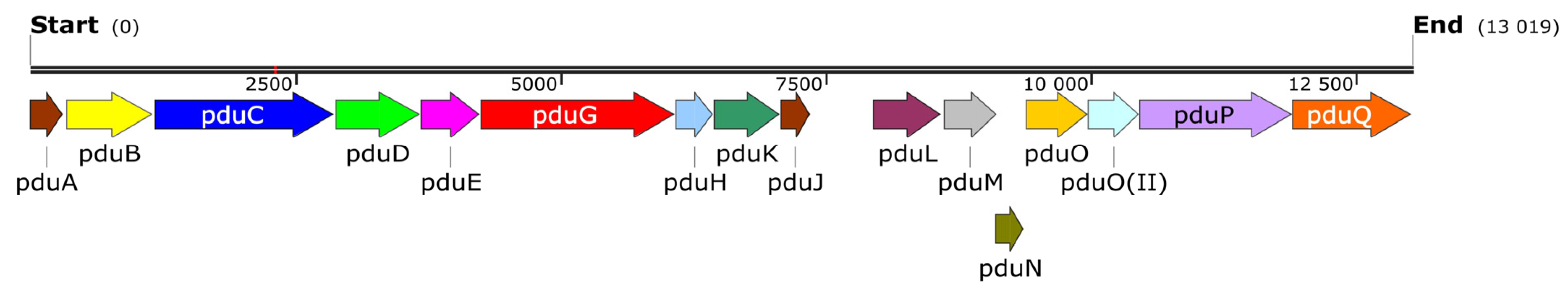 - Sauvageot, N.; Muller, C.; Hartke, A.; Auffray, Y.; Laplace, J.-M. Characterisation of the diol dehydratase pdu operon of Lactobacillus collinoides. FEMS Microbiol. Lett. 2002, 209, 69–74. [Google Scholar] [CrossRef]