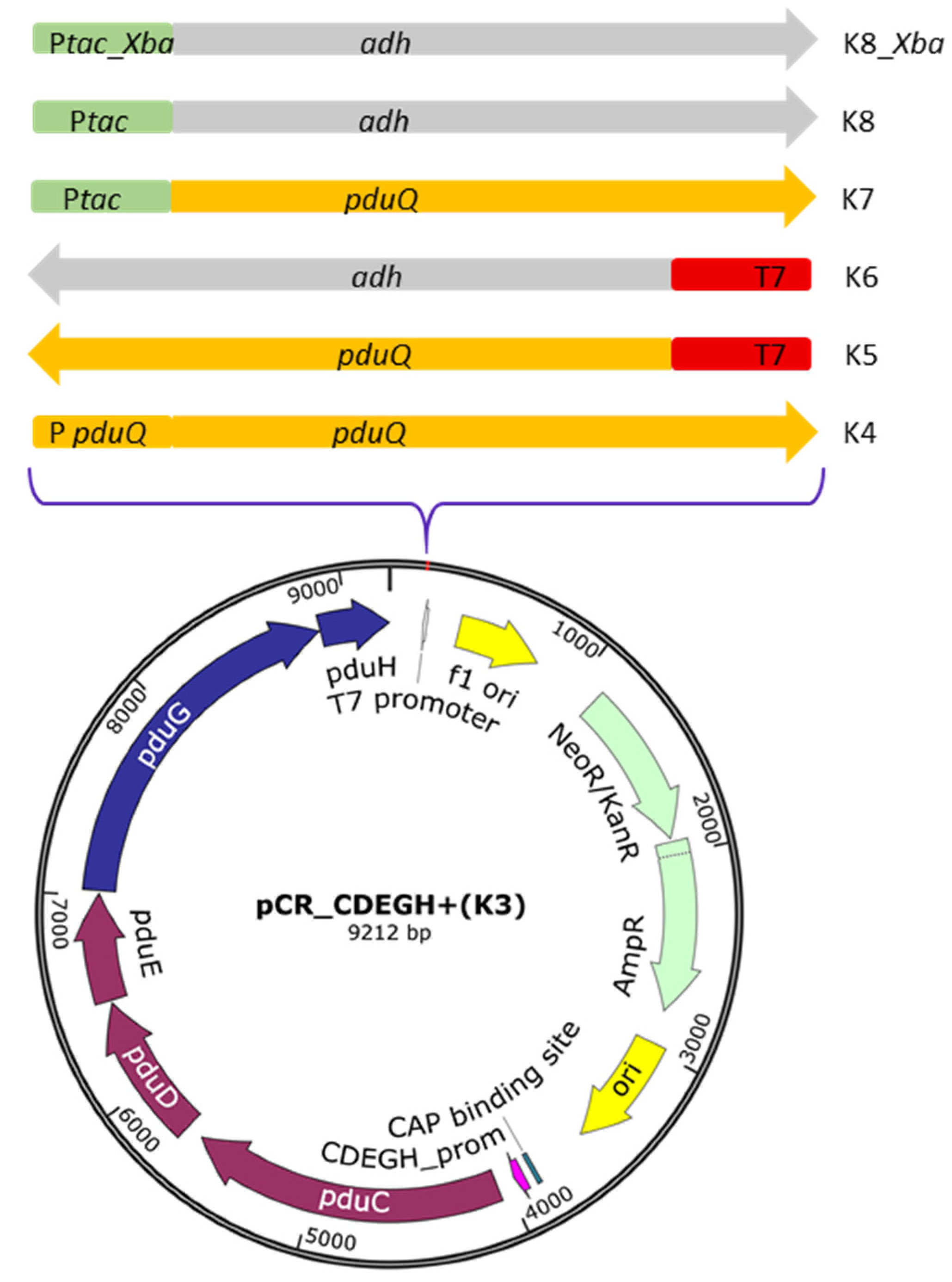 | K. pneumonia ATCC 9621 K8 | K. pneumoniae G31 with pCR_pduC+DEGH_Ptac_XbaI_adh | This study |