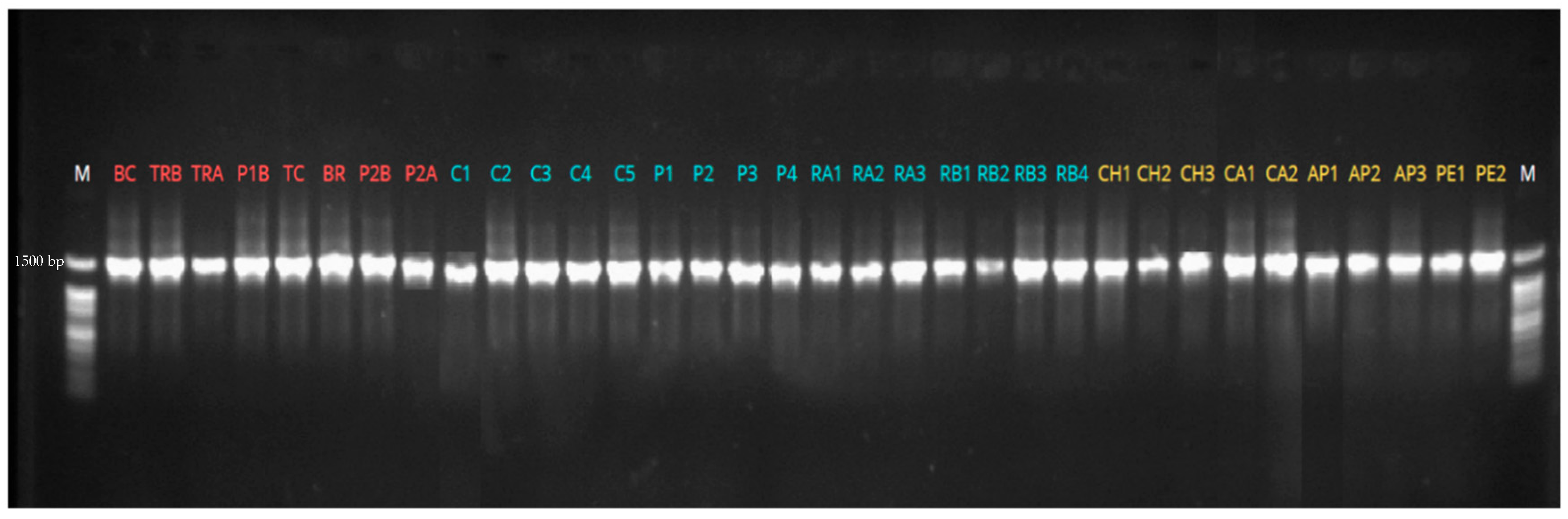 - Lee, P.Y.; Costumbrado, J.; Hsu, C.-Y.; Kim, Y.H. Agarose Gel Electrophoresis for the Separation of DNA Fragments. J. Vis. Exp. JoVE 2012, 62, 3923. [Google Scholar] [CrossRef]