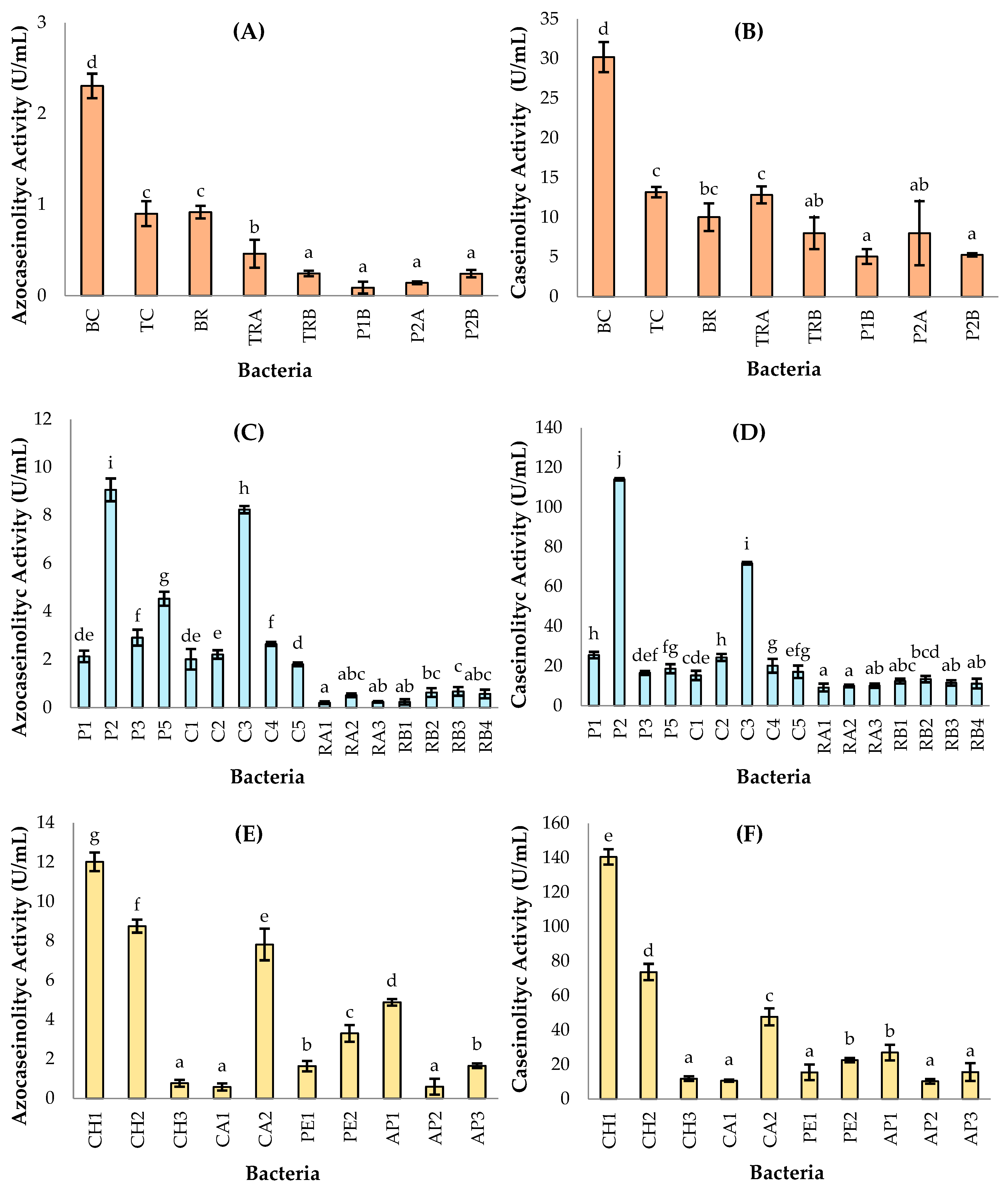 3.3. Evaluation of the Proteolytic Capacity of the Identified Strains