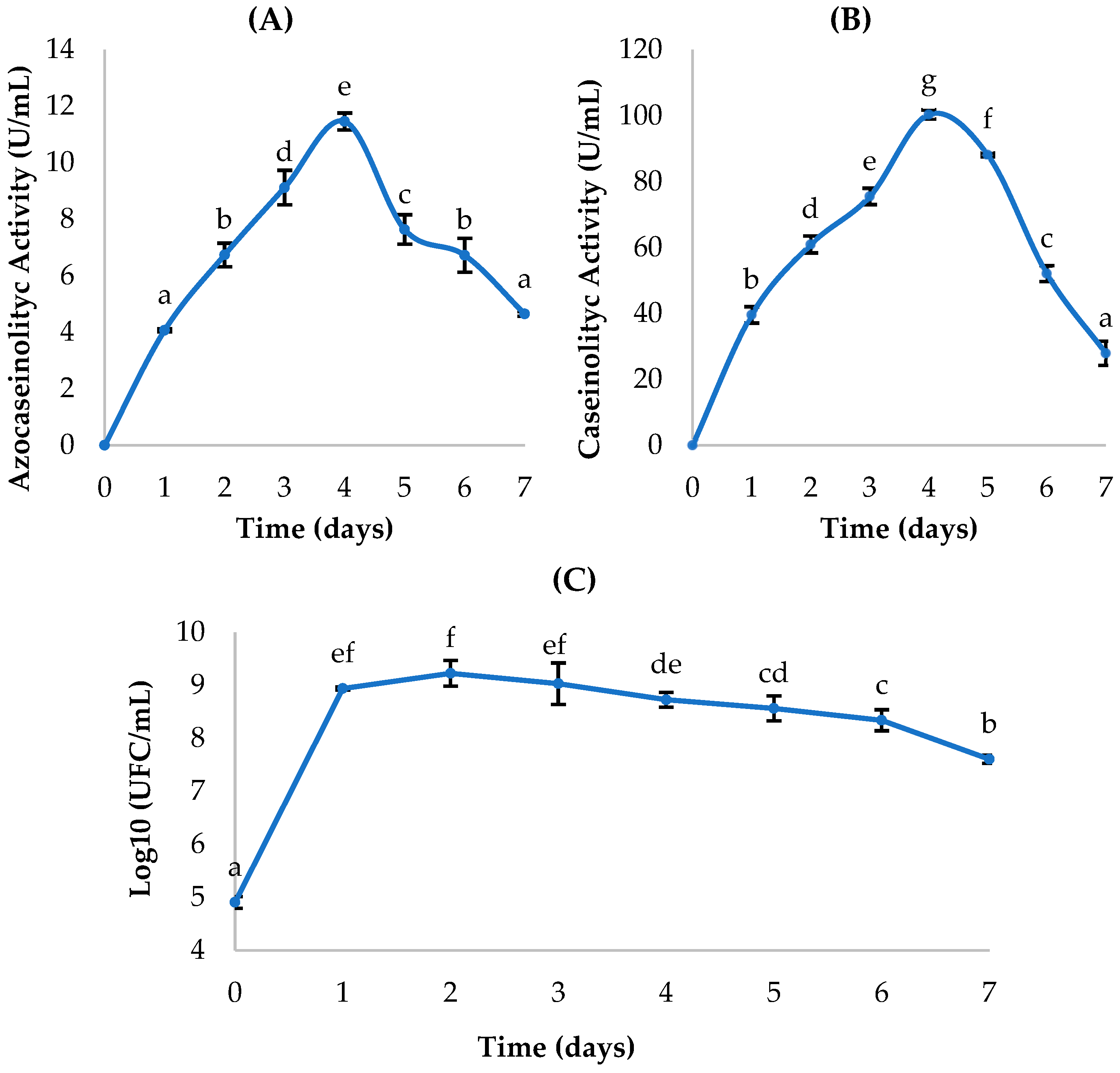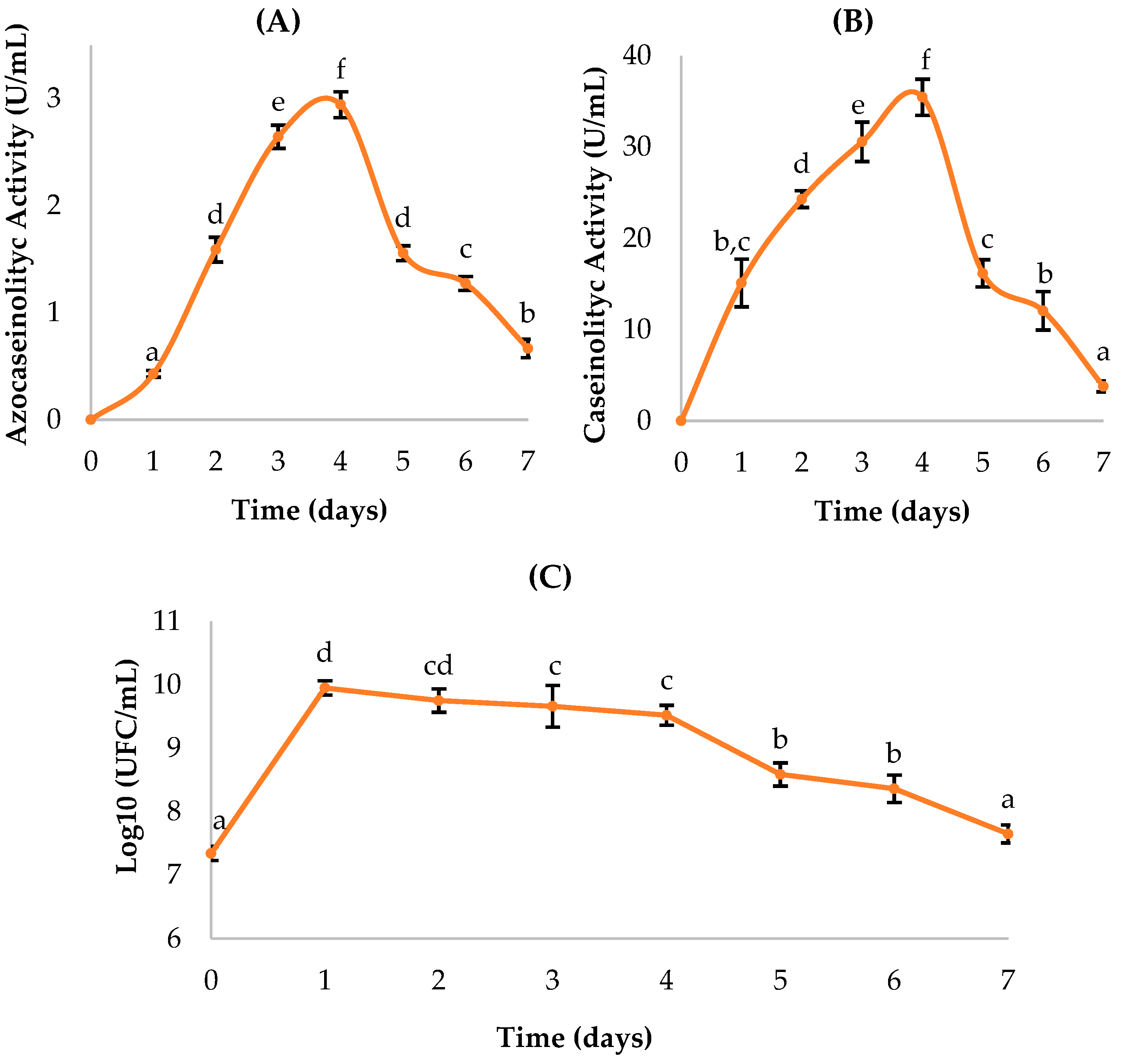 3.3.4. Kinetics of Enzyme Production and Bacterial Growth