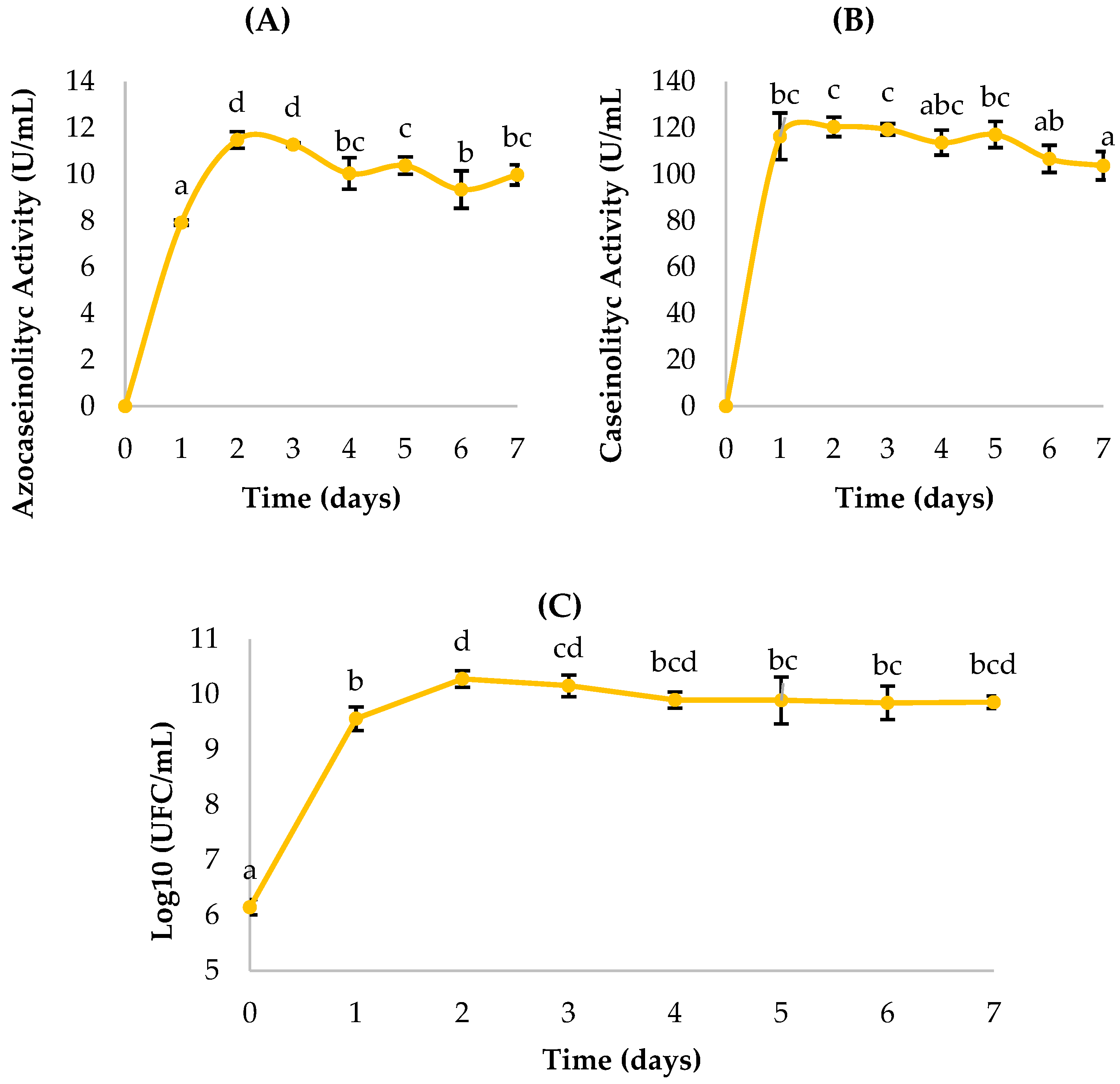 2.3.2. Enzyme Production and Bacterial Growth Kinetics