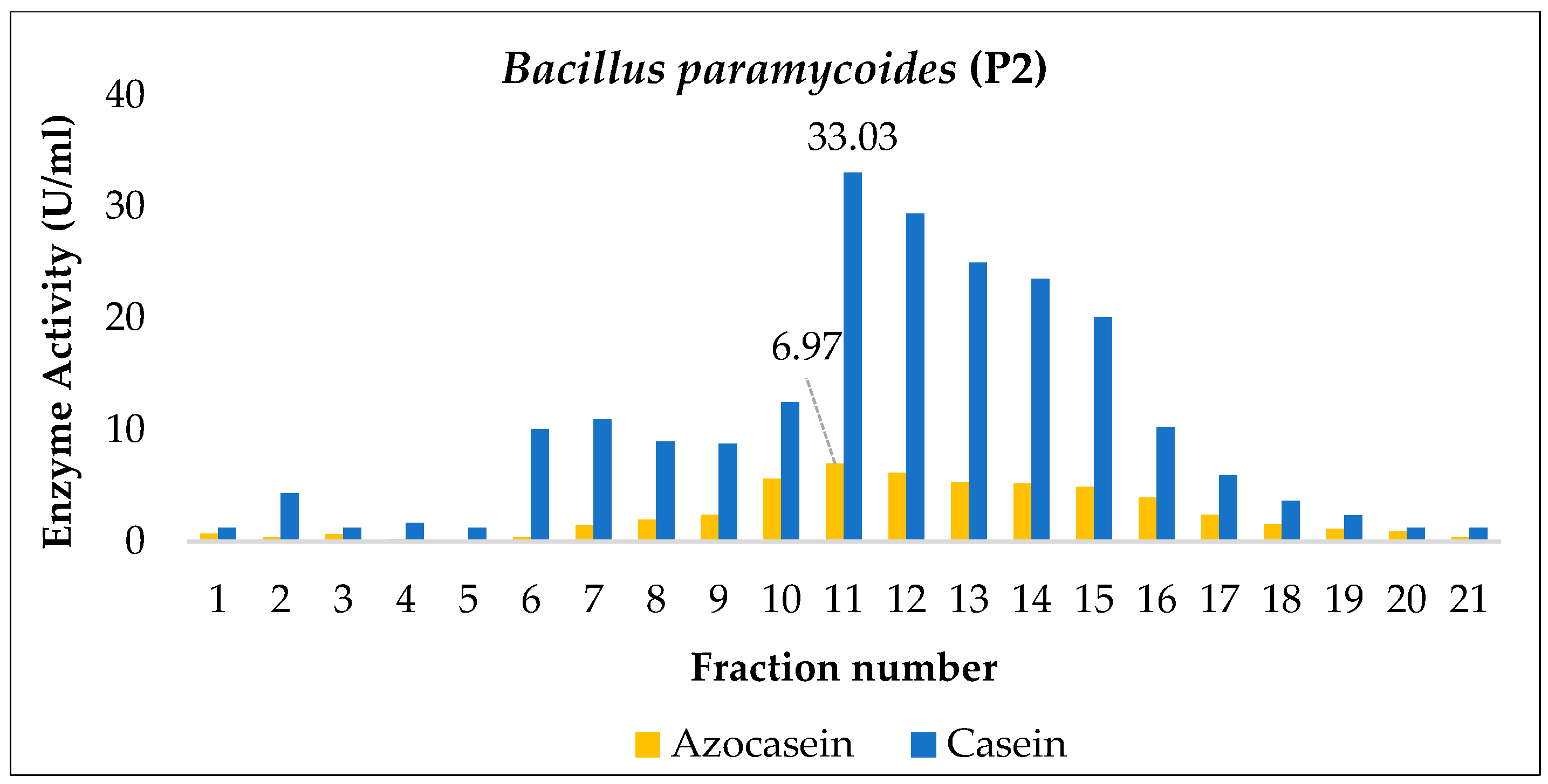 - Ullah, N.; Rehman, M.U.; Sarwar, A.; Nadeem, M.; Nelofer, R.; Shakir, H.A.; Irfan, M.; Idrees, M.; Naz, S.; Nabi, G.; et al. Purification, Characterization, and Application of Alkaline Protease Enzyme from a Locally Isolated Bacillus cereus Strain. Fermentation 2022, 8, 628. [Google Scholar] [CrossRef]