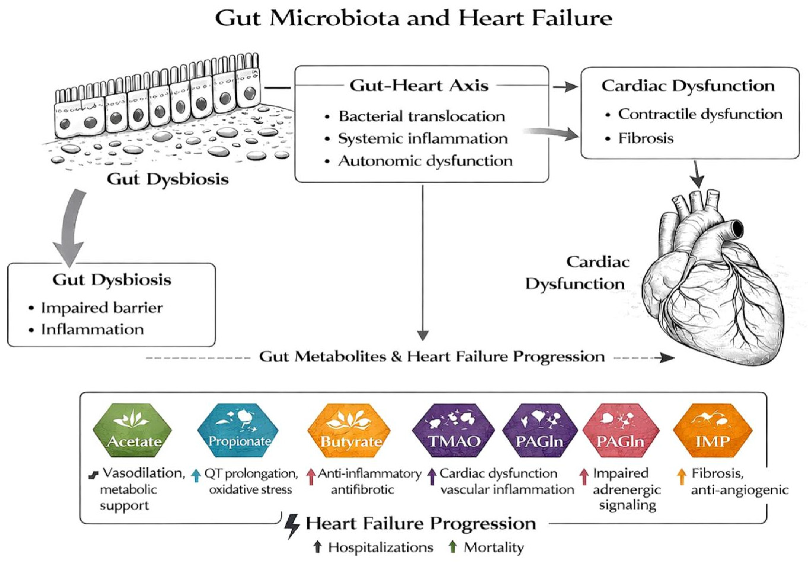 - Guo, S.; Zhang, W.; Cui, X.; Yin, B. The bidirectional regulatory mechanism of gut microbiota metabolites on myocardial injury in heart failure from the perspective of the gut-heart axis: A review. Front. Microbiol. 2025, 16, 1710051. [Google Scholar] [CrossRef] [PubMed]