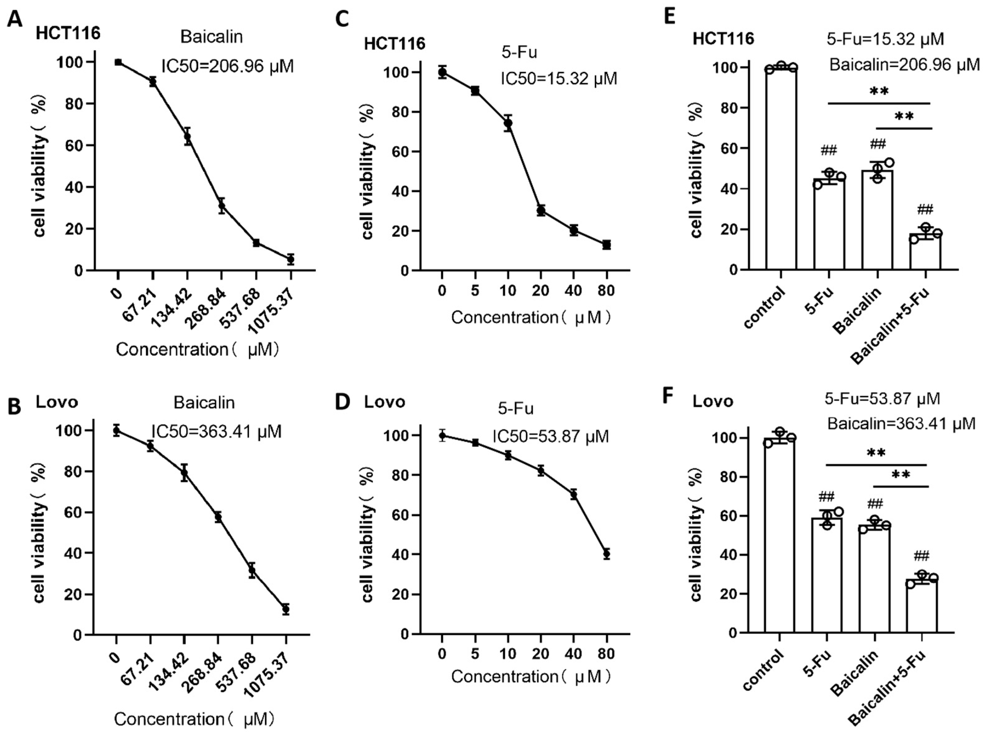 Baicalin (purity > 98%; Yuanye, China, Shanghai, #B20570) and 5-fluorouracil (Solarbio, China, Beijing, #F8300) were used in this study. When cells reached approximately 60% confluence, they were exposed to a range of concentrations of the two drugs and incubated for an additional 24 h. Following incubation, cells were harvested via trypsinization and quantified for subsequent experiments. The concentration ratios of Baicalin to 5-fluorouracil are provided in