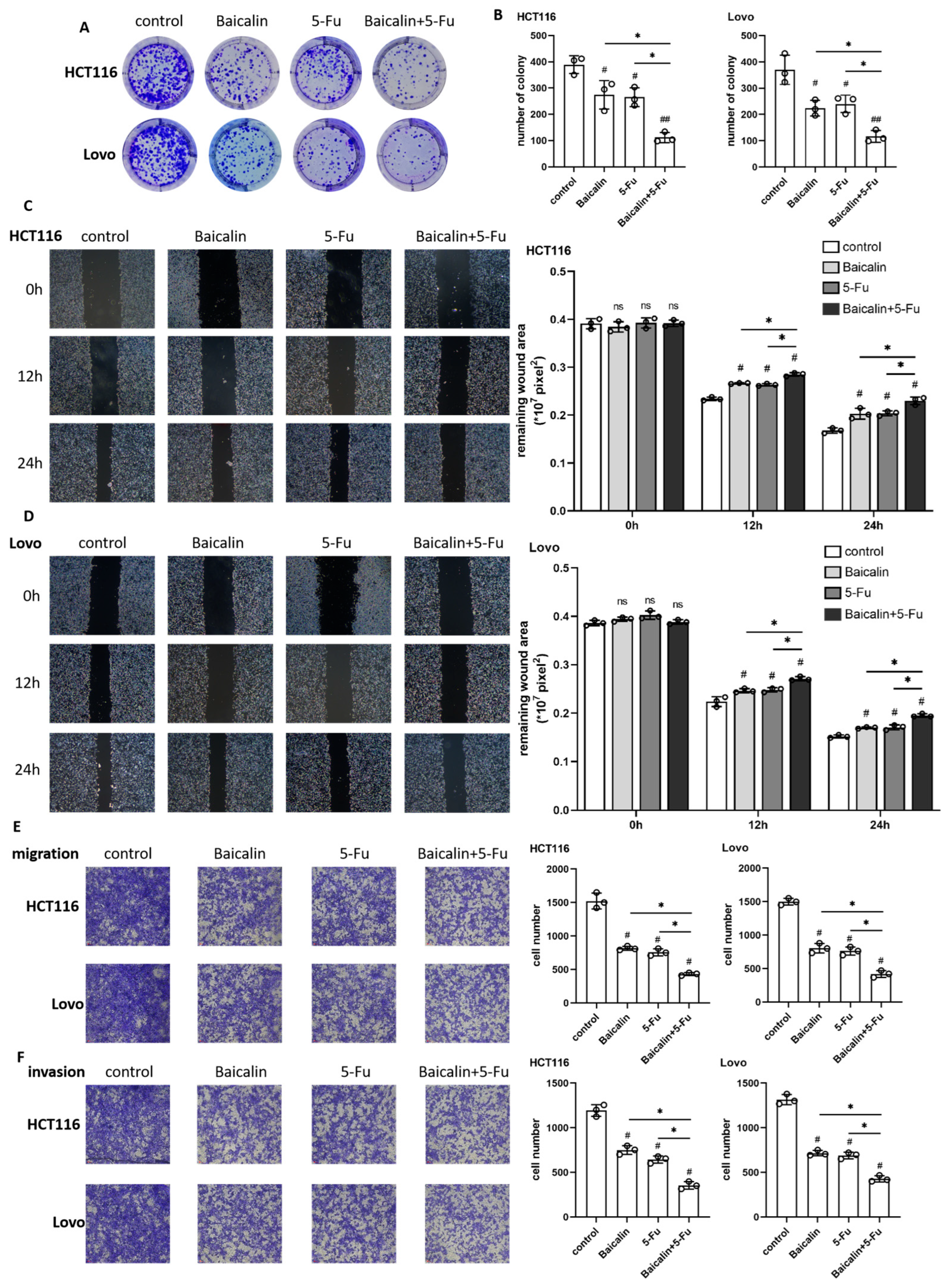 Our investigation began by characterizing the individual and combined cytotoxic effects of both agents. The observed dose-dependent suppression of viability in HCT116 and Lovo cells, along with their distinct IC50 values, highlights the inherent heterogeneity in CRC cell responses to chemotherapeutic agents. The significant enhancement of growth inhibition in combination treatments at IC50 concentrations strongly suggested a synergistic interaction, a notion robustly confirmed across multiple functional assays. It is important to note that while our data consistently demonstrate a greater-than-additive inhibitory effect of the baicalin/5-Fu combination across multiple functional assays, a formal assessment of enhancement using combination index (CI) analysis was not performed. This improvement needs to be further evaluated in our future experiment. The combination regimen most potently suppressed colony formation, wound closure, and Transwell migration/invasion, indicating that Baicalin potentiates 5-Fu’s efficacy beyond a simple additive effect, presumably by engaging complementary cytotoxic pathways.