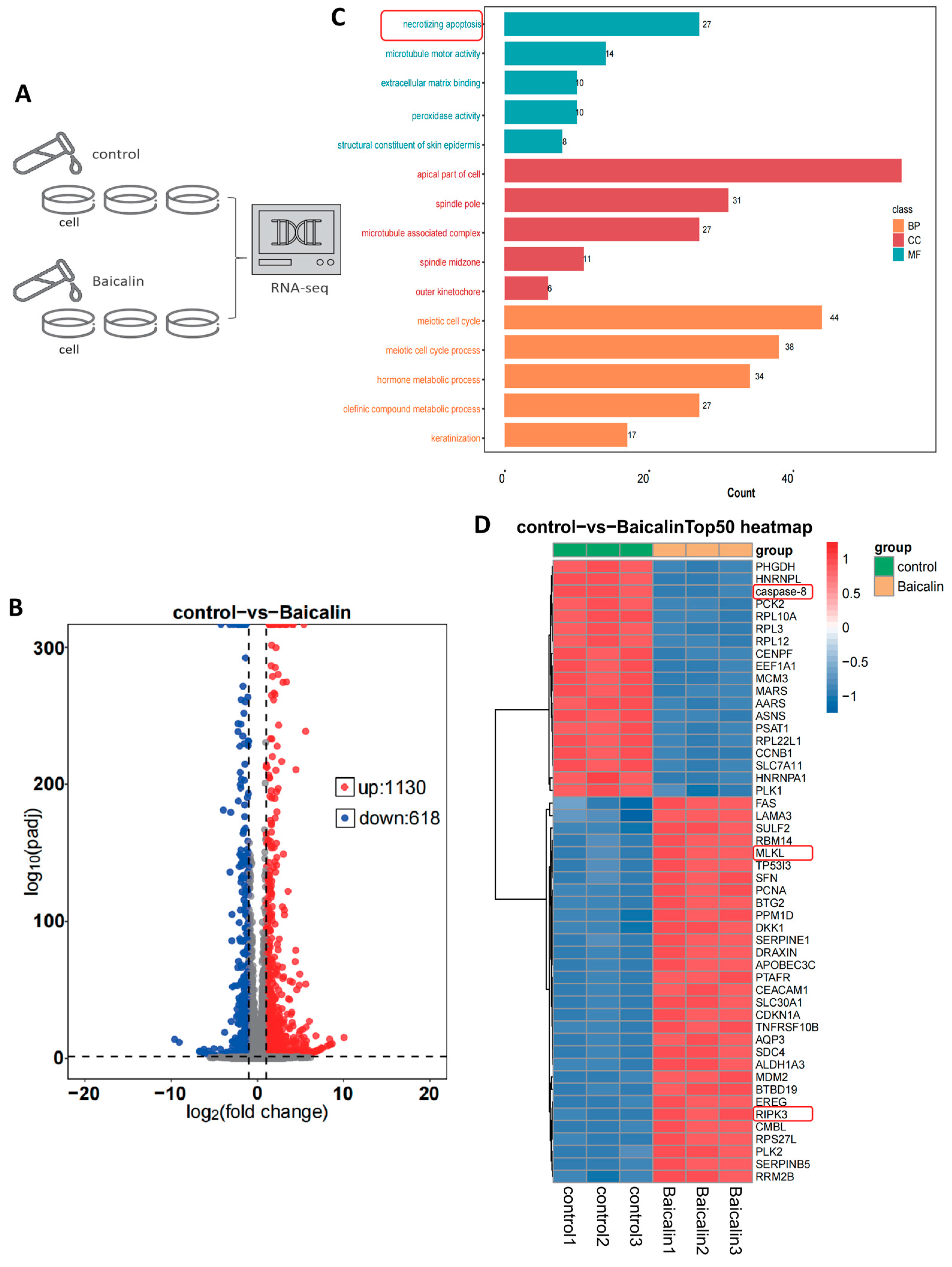 Total RNA extracted from the various treatment groups underwent high-throughput sequencing on an Illumina platform (conducted by Apexbio Company, Houston, TX, USA). Differential gene expression analysis between Baicalin-treated and control groups was performed, with genes meeting the criteria of |log2 fold change (FC)| > 1 and an adjusted p-value < 0.05 defined as differentially expressed genes (DEGs). Gene Ontology (GO) enrichment analysis was subsequently performed on the identified DEGs, and the results were graphically represented using R-4.2.3 software.