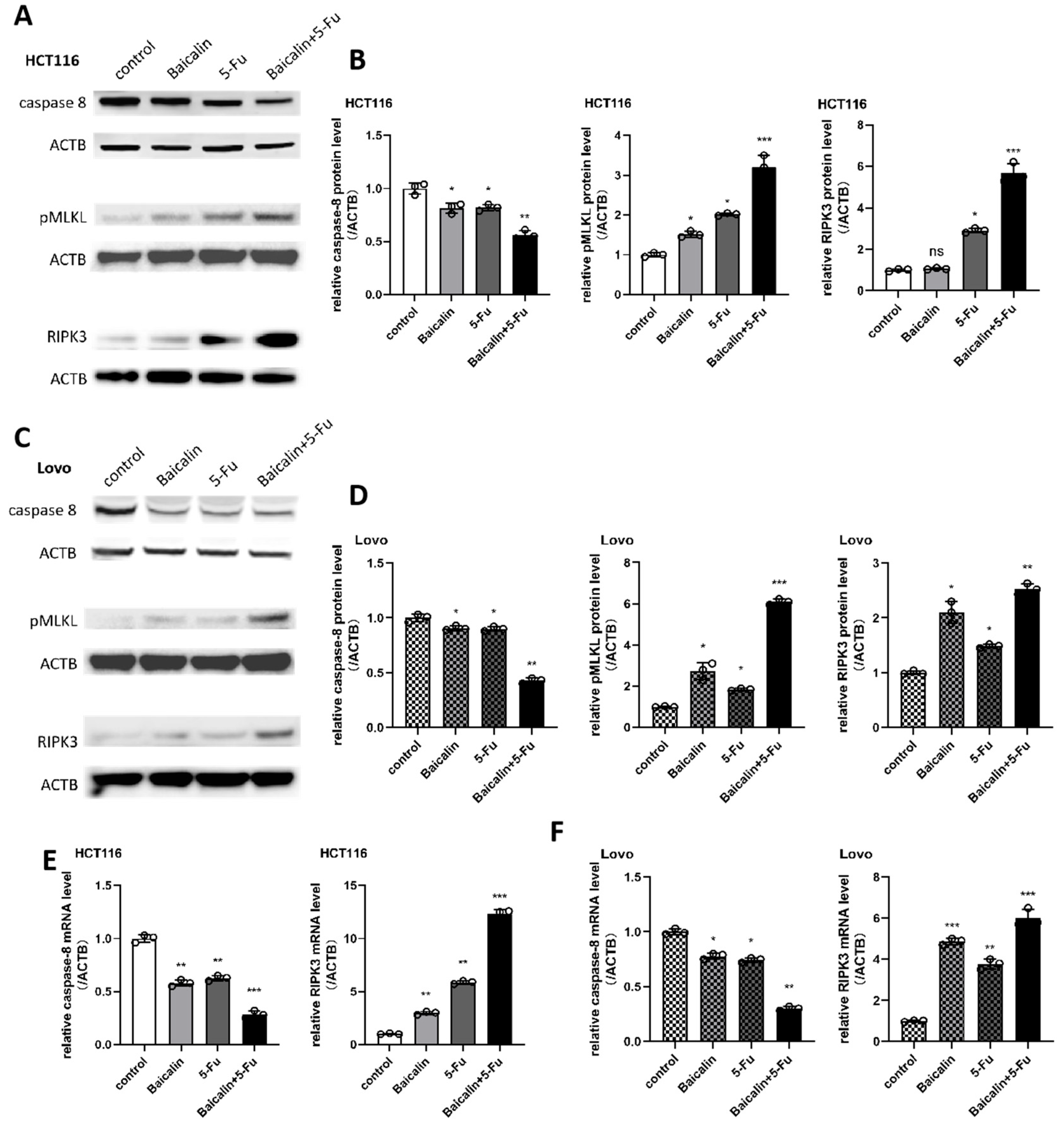 31]. We therefore propose a mechanistic model wherein Baicalin initiates necroptotic signaling, potentially by suppressing caspase-8 activity, thereby releasing the inhibitory brake on RIPK1/RIPK3 complex formation. Meanwhile, 5-Fu induces DNA damage and apoptotic stress, creating a cellular environment where the activation of this parallel death pathway results in profound synergistic cytotoxicity. Notably, this mechanism may be particularly effective in 5-Fu-resistant CRC cells, which often exhibit reduced apoptotic capacity but retain the ability to undergo necroptosis.