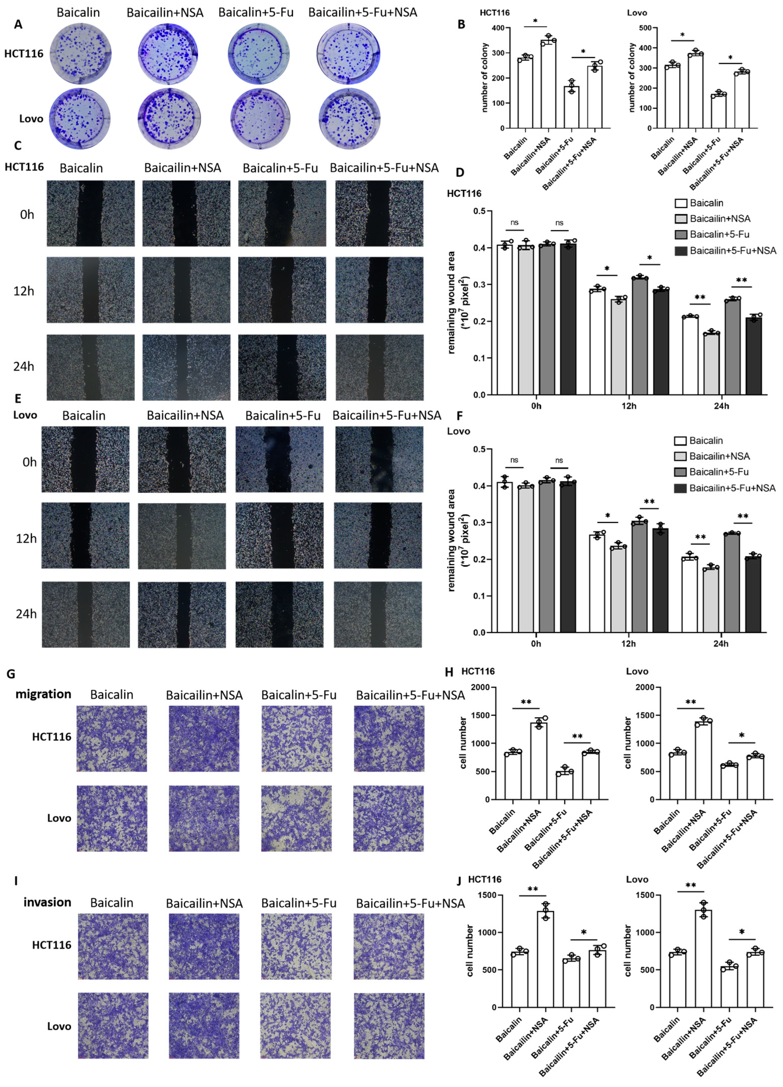 Specific pathogen-free (SPF) BALB/c nude mice, aged 5–6 weeks, were randomly assigned to different experimental groups. A suspension of HCT116 human colorectal cancer cells (1 × 107 cells in 100 µL) was subcutaneously inoculated into the flank of each mouse. After a six-week period of tumor growth, the mice were humanely euthanized, and the resulting subcutaneous tumors were carefully excised. Tumor volume and weight were recorded. Tumor volume (V) was calculated using the formula V = (L × W2)/2, where L and W correspond to the longest and perpendicular shortest tumor diameters, respectively. The doses of Baicalin (50 mg/kg) and 5-Fu (20 mg/kg) were used in our xenograft models. Baicalin and NSA were administered daily via intraperitoneal injection due to their relatively short half-lives, while 5-Fu was given twice weekly to mimic clinical cycles and reduce cumulative toxicity. Treatment was initiated when tumors reached approximately 200 mm3 to model established disease.