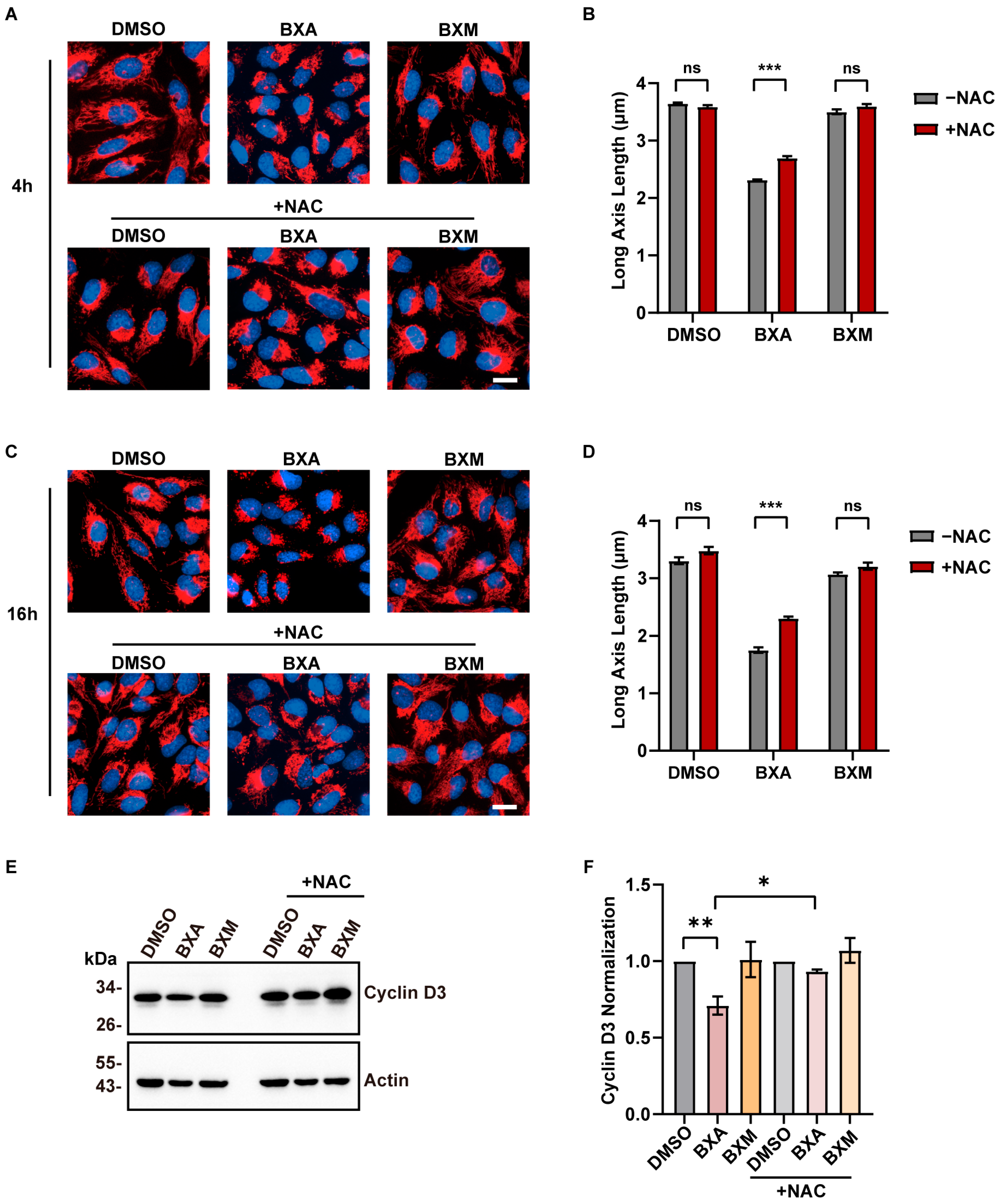 2.5. N-Acetylcysteine Alleviates BXA-Induced Mitochondrial Fragmentation and the Decreased Expression of Cyclin D3