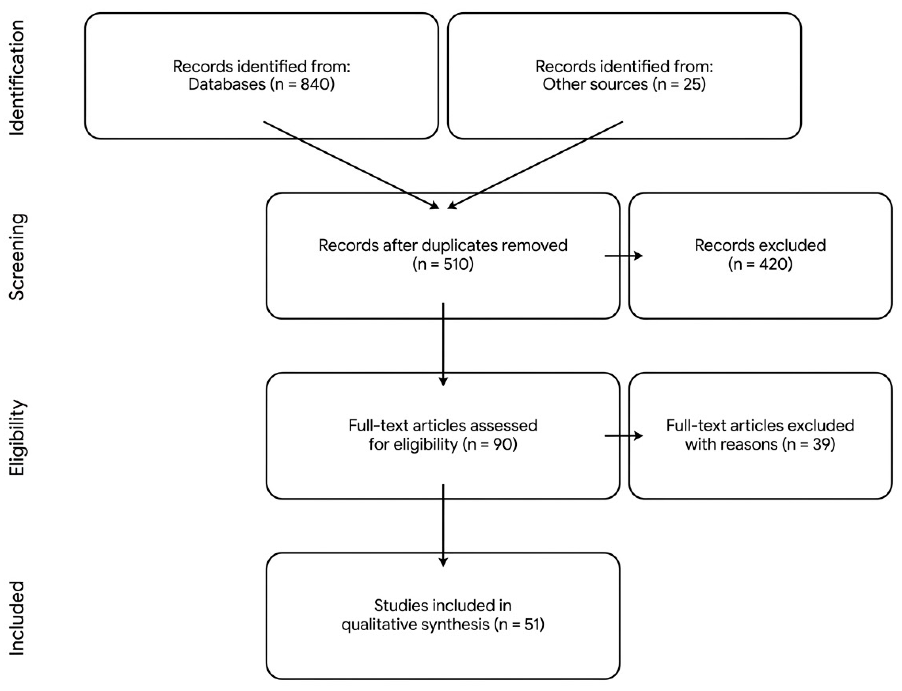 The flow diagram illustrates the systematic process of identification, screening, eligibility, and inclusion of studies for this review. From an initial identification of 865 records across three electronic databases (PubMed/MEDLINE, Scopus, and Web of Science) and secondary sources, 51 studies met the pre-defined inclusion criteria. The selection focused on clinical trials, international guidelines (ESC/ASCO), and high-impact systematic reviews published between 2015 and 2026 to ensure an updated evidence base for the cardiovascular management of cancer patients.