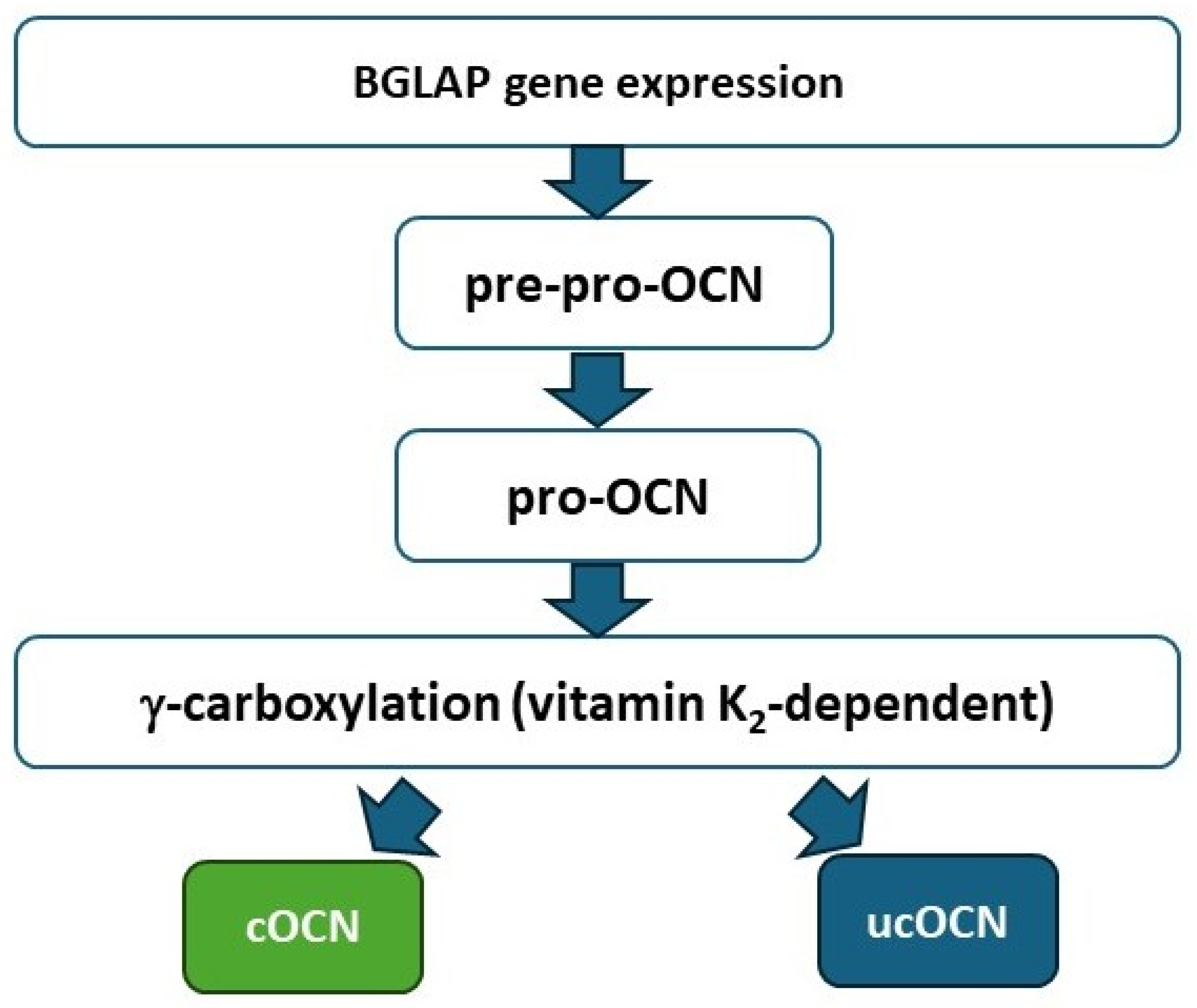 | Vitamin D3 (diet/sunlight) | Increases BGLAP transcription; promotes osteoblast maturation | Increased OCN synthesis; synergy with K2 for functional activation | [66,76] |