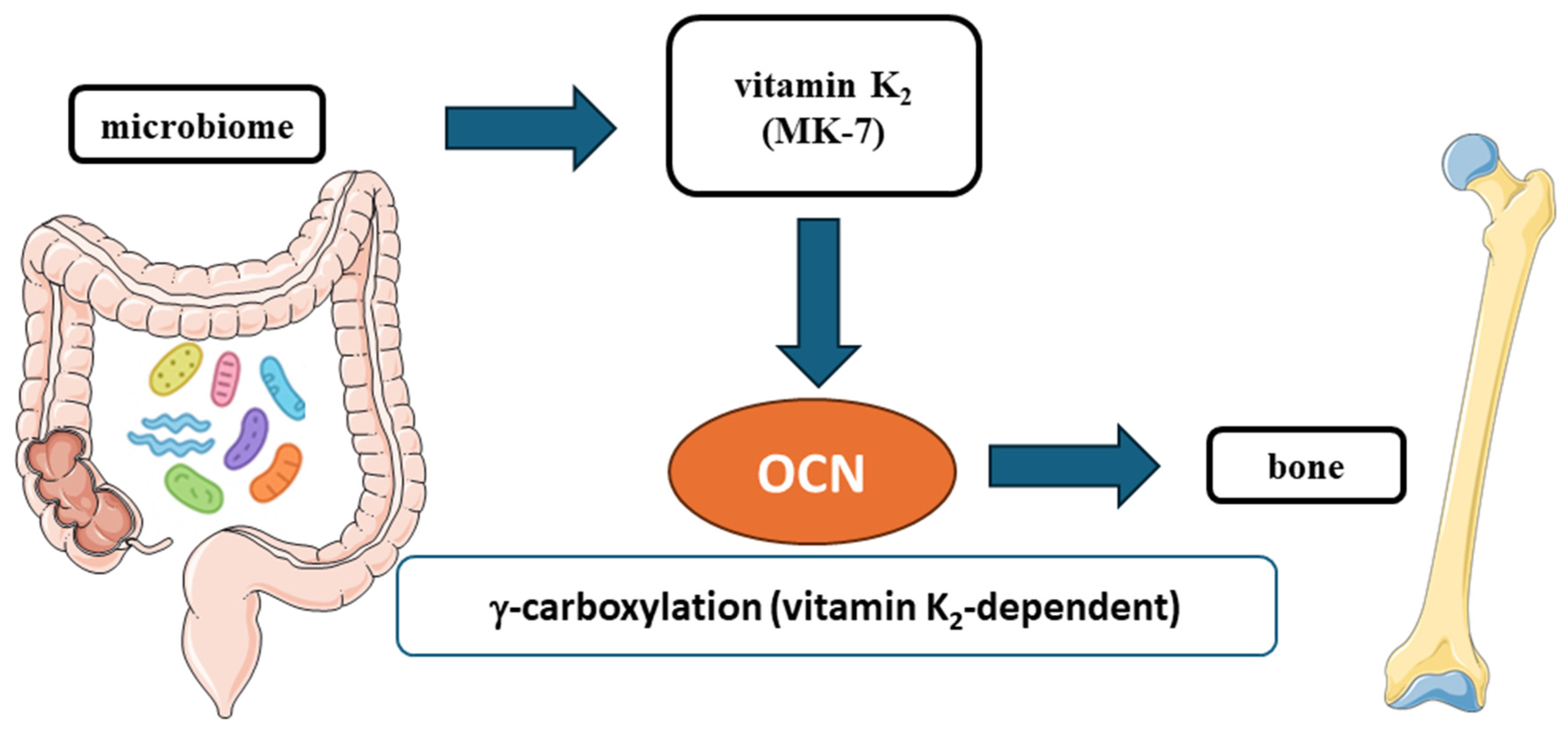 | Microbiome (Bacillus, Bifidobacterium) | Menaquinone (MK-n) synthesis | Endogenous K2 supports OCN carboxylation potential | [65] |