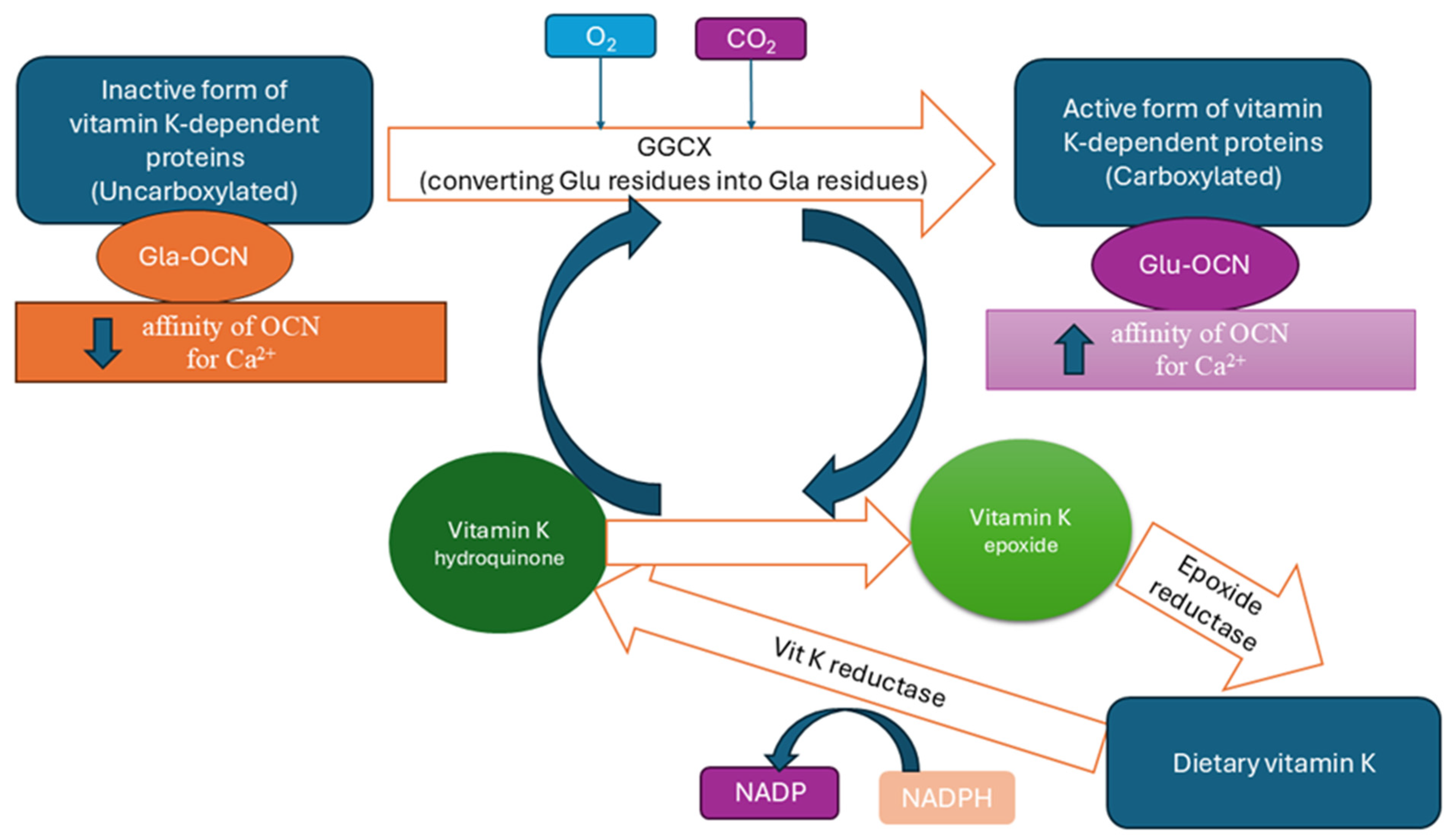 | Vitamin K insufficiency | Reduced cofactor availability for GGCX | Increased ucOCN; associated with fracture risk | [19,67] |
