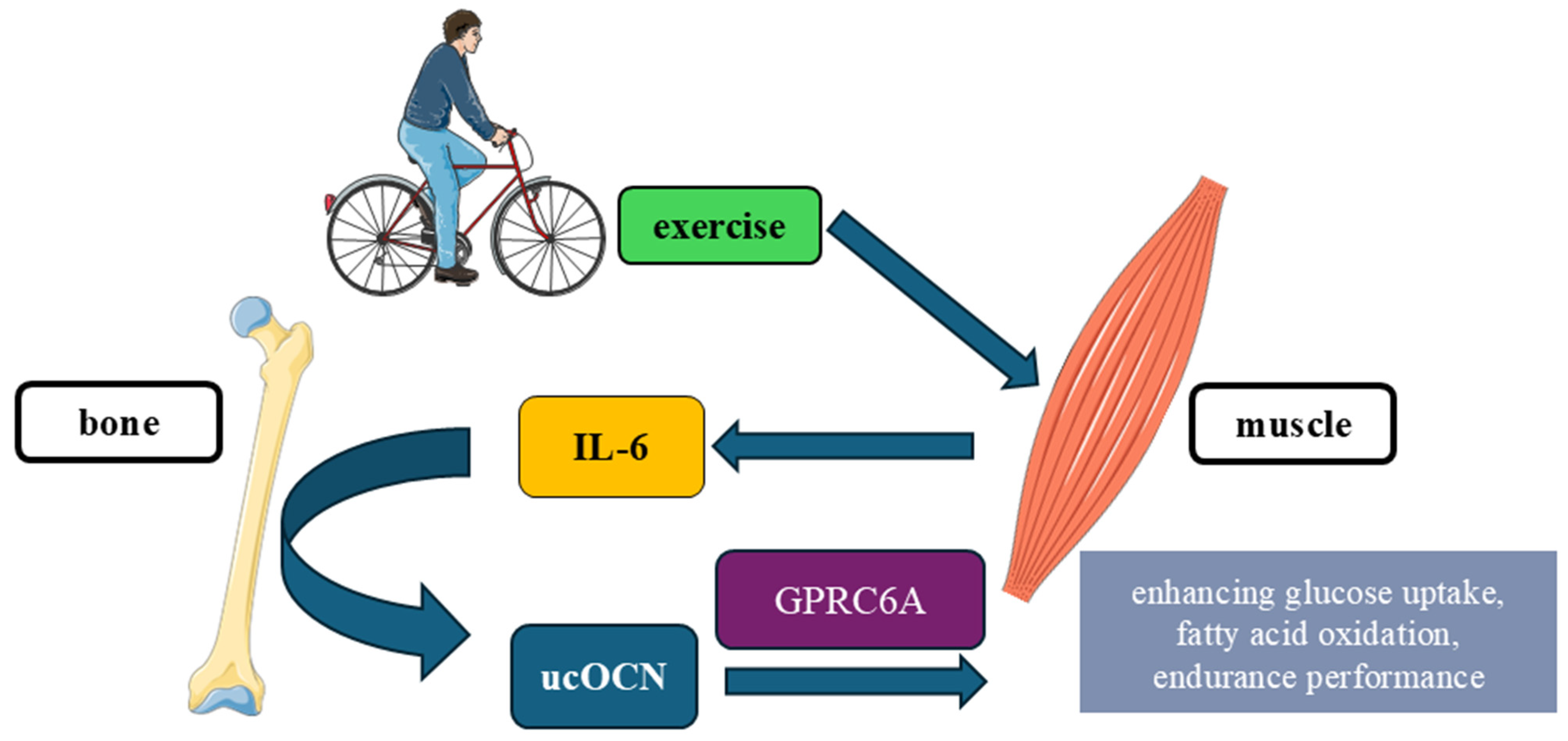 | Exercise as a physiological stressor (muscle–bone–muscle axis) | Adults; rodent–human translation | Total OCN or ucOCN (depending on protocol) | Acute aerobic exercise increases circulating OCN. Muscle-derived IL-6 stimulates osteoblasts to release OCN, forming a feed-forward loop that enhances exercise capacity | Muscle-derived IL-6 stimulates osteoblast-dependent OCN release; OCN improves muscle fuel utilization. | [134,135] |