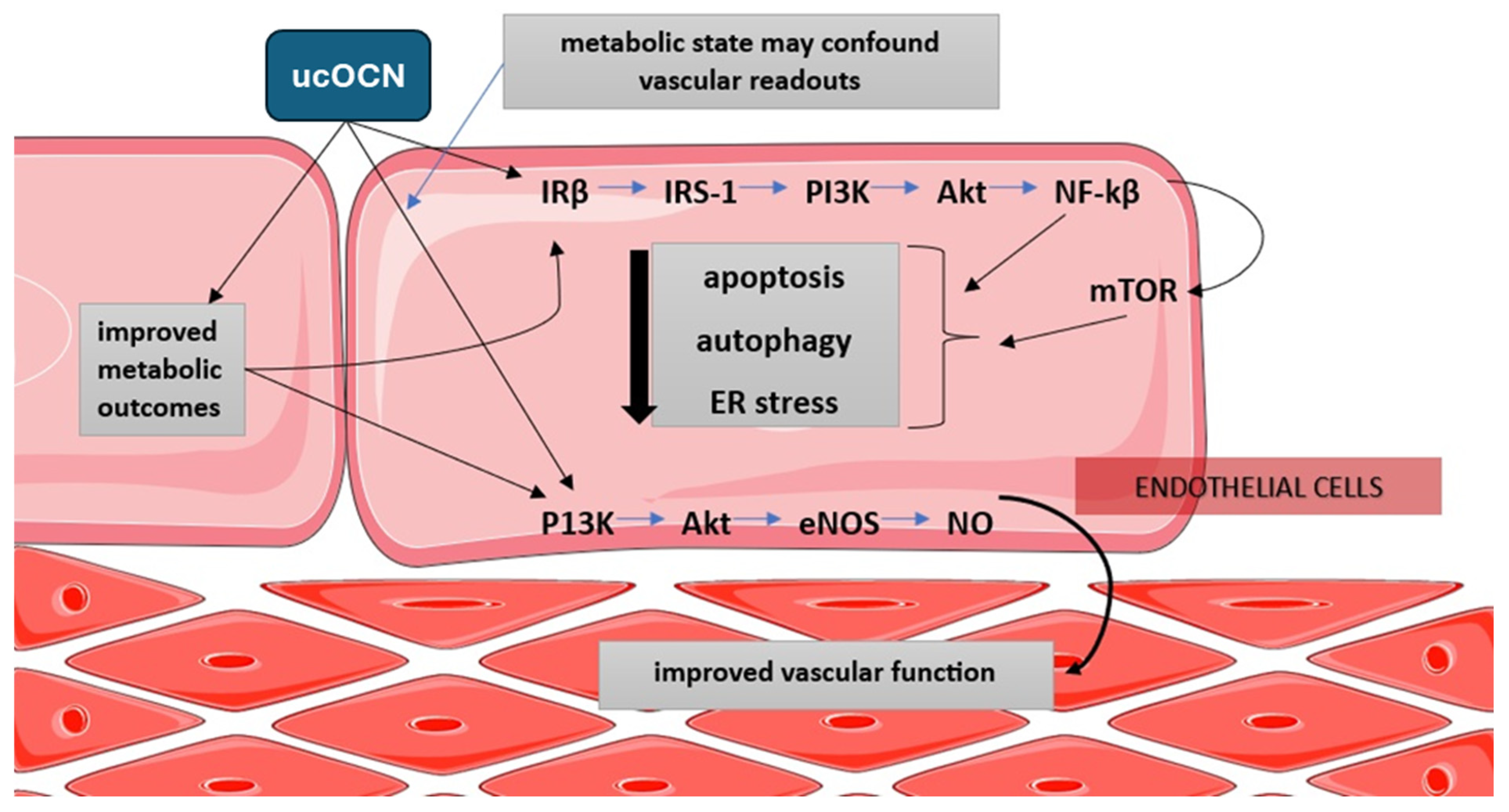 | NO bioavailability | Endothelial cells (in vitro) | ucOCN → IRβ → PI3K → Akt → eNOS | Increased NO production | ucOCN improves endothelial tone | [159] |
