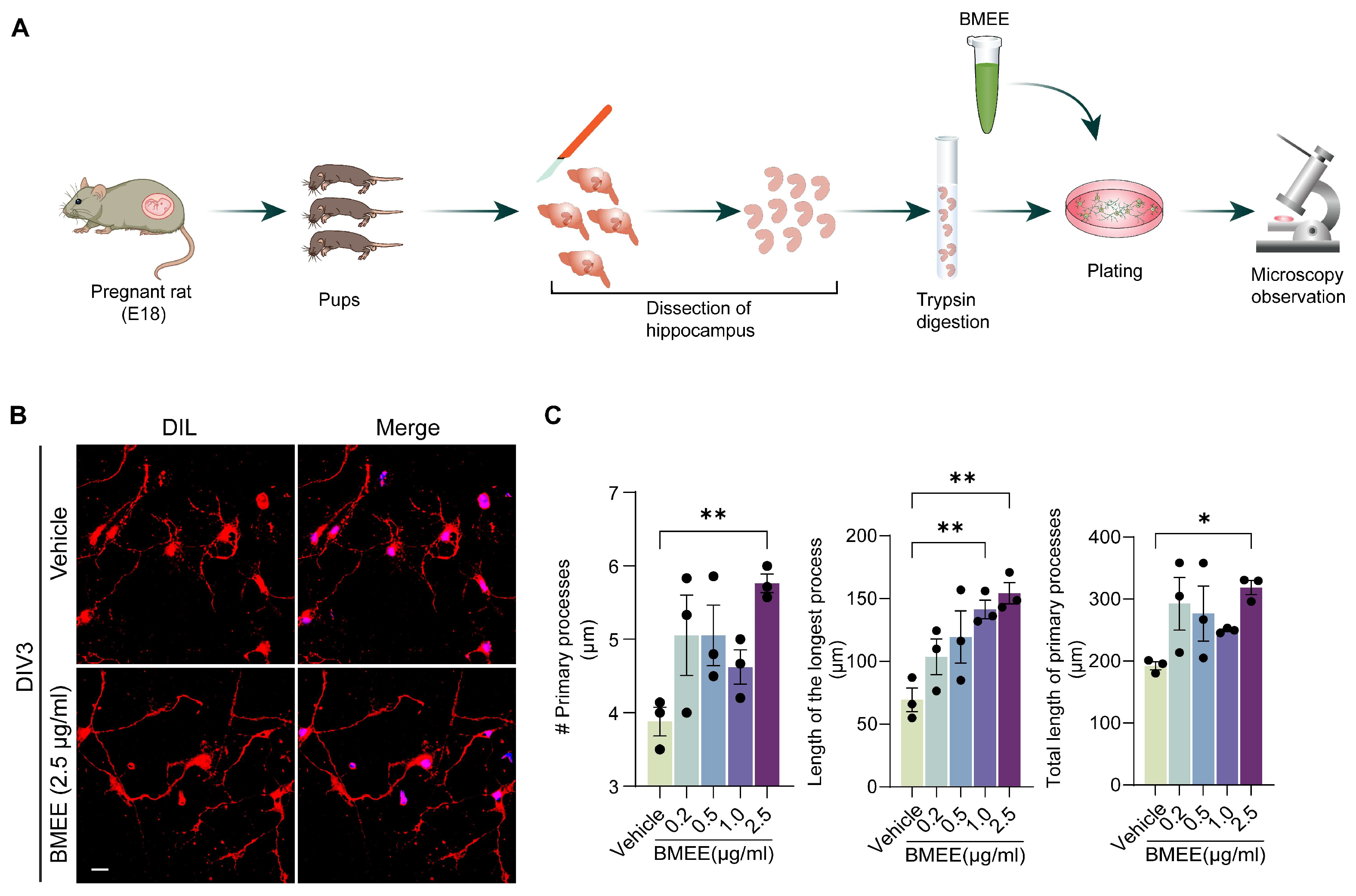 2.4.3. BMEE Positively Modulates Synaptogenesis