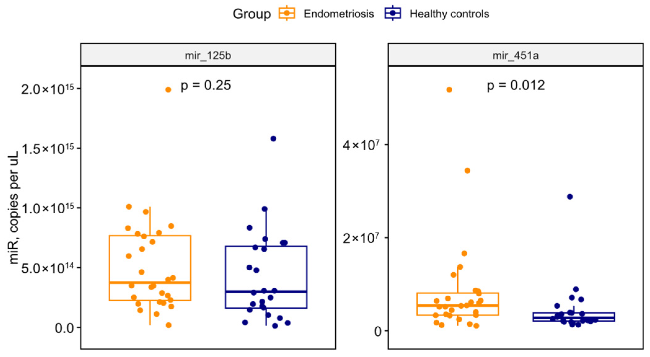 - Nothnick, W.B.; Falcone, T.; Joshi, N.; Fazleabas, A.T.; Graham, A. Serum MiR-451a Levels Are Significantly Elevated in Women With Endometriosis and Recapitulated in Baboons (Papio Anubis) With Experimentally-Induced Disease. Reprod. Sci. 2017, 24, 1195–1202. [Google Scholar] [CrossRef] [PubMed]