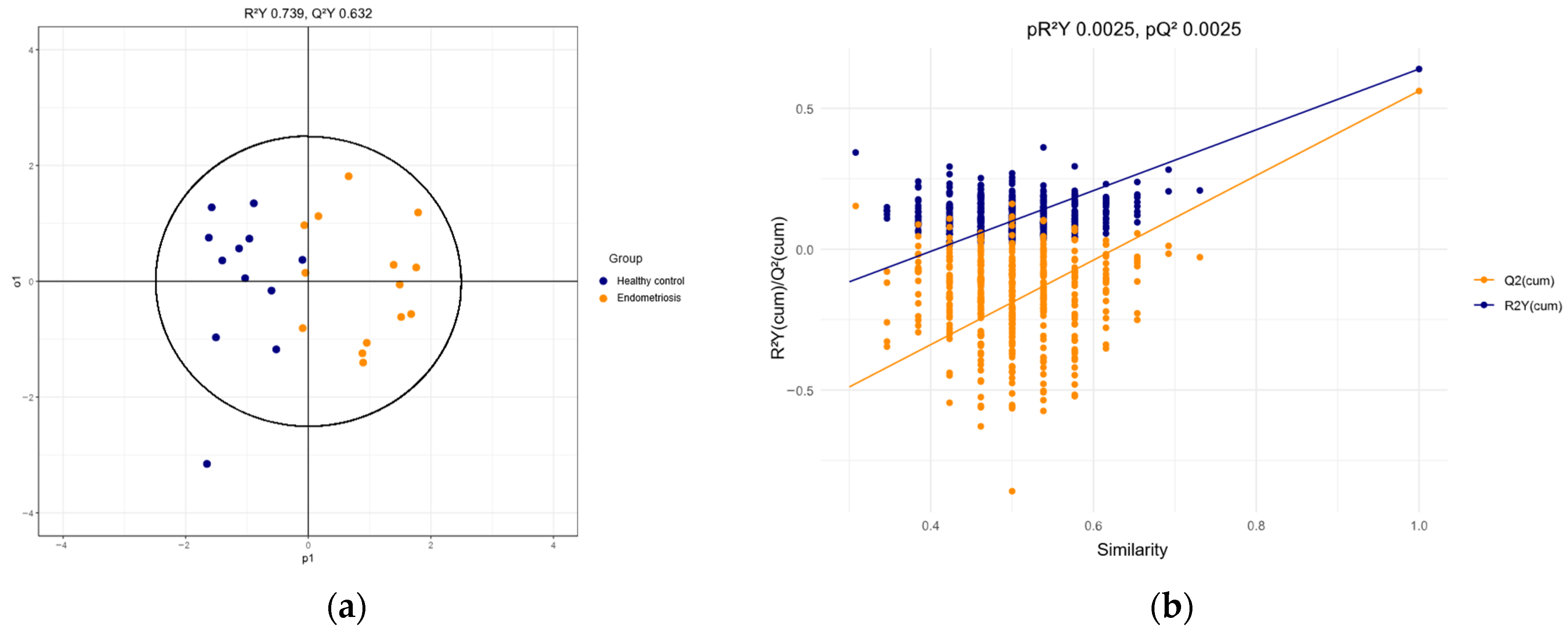 - Dutta, M.; Singh, B.; Joshi, M.; Das, D.; Subramani, E.; Maan, M.; Jana, S.K.; Sharma, U.; Das, S.; Dasgupta, S.; et al. Metabolomics Reveals Perturbations in Endometrium and Serum of Minimal and Mild Endometriosis. Sci. Rep. 2018, 8, 6466, Erratum in Sci. Rep. 2020, 10, 2790. https://doi.org/10.1038/s41598-020-59776-9. [Google Scholar] [CrossRef] [PubMed] [PubMed Central]