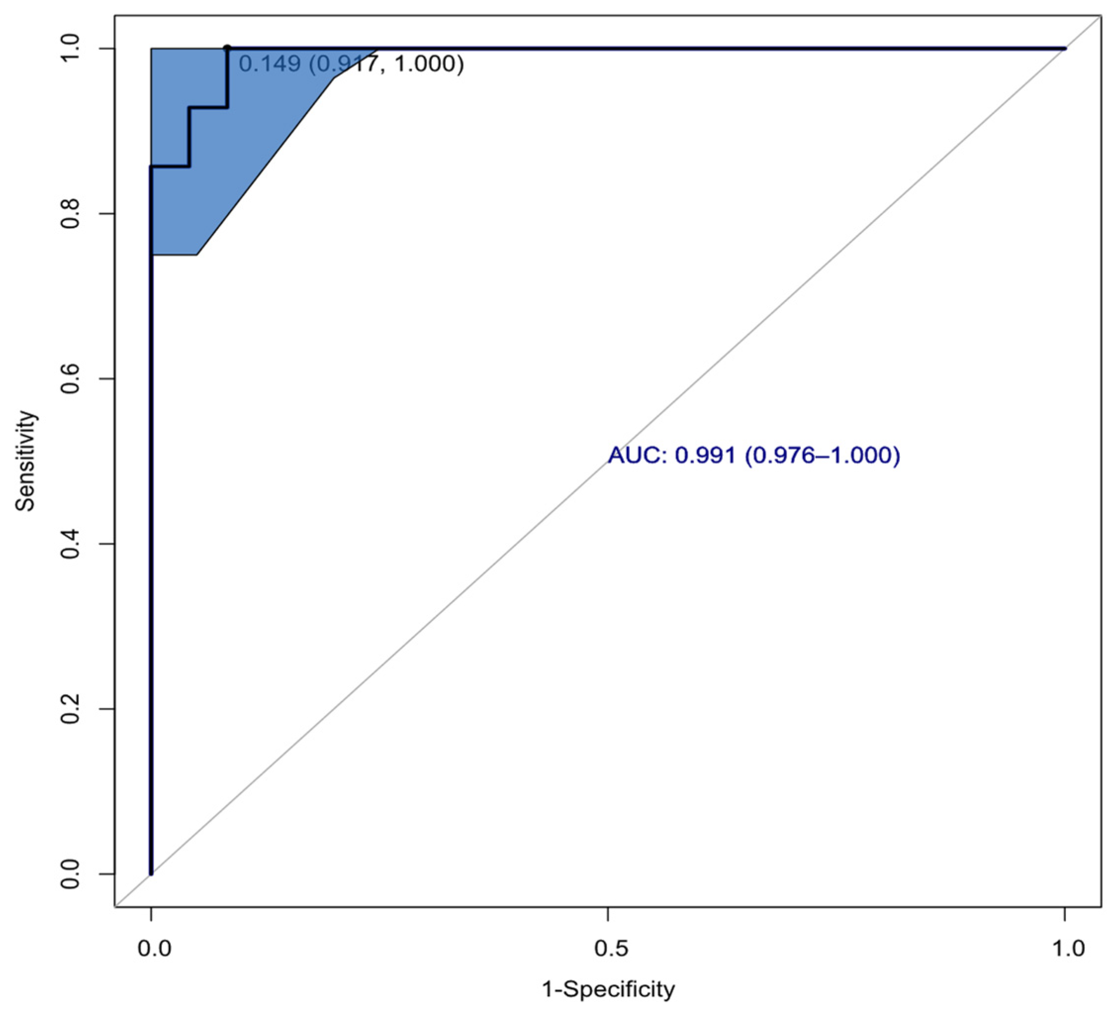 | Endometriosis vs. Healthy control | 0.958 | 0.964 | 0.994 (0.976–1.000) | Intercept | −1.405 | 0.758 | −2.432 | 0.014 |