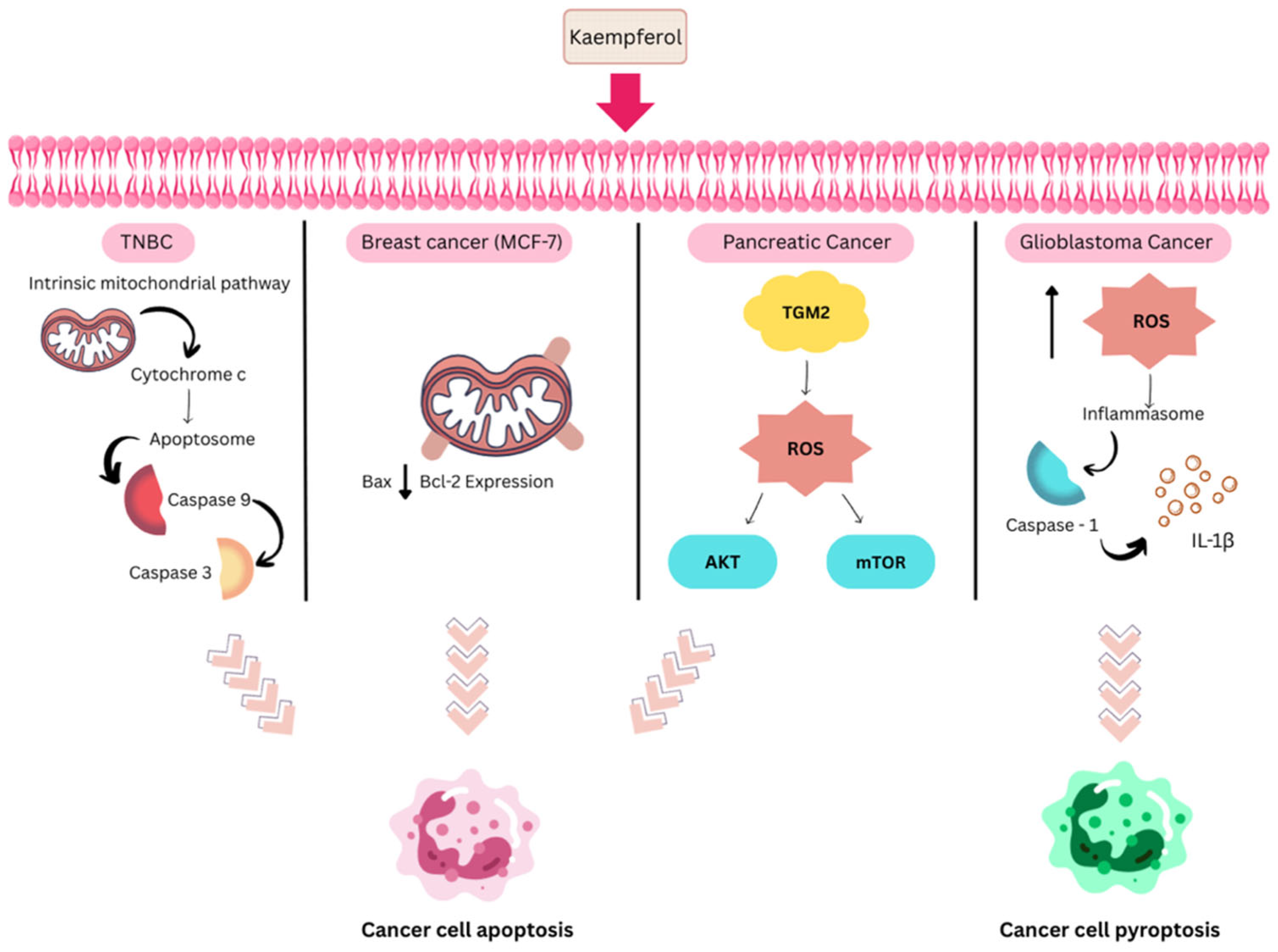 | Breast cancer T-47D and MDA-MB-231 cells | Acacetin exerts its anticancer effects on breast carcinoma cells by inducing cell cycle arrest, generating ROS, and activating RIP1-dependent necroptosis, effects that are modulated by ROS inhibition with NAC and RIP1 inhibition with Necrostatin-1. | [164] |