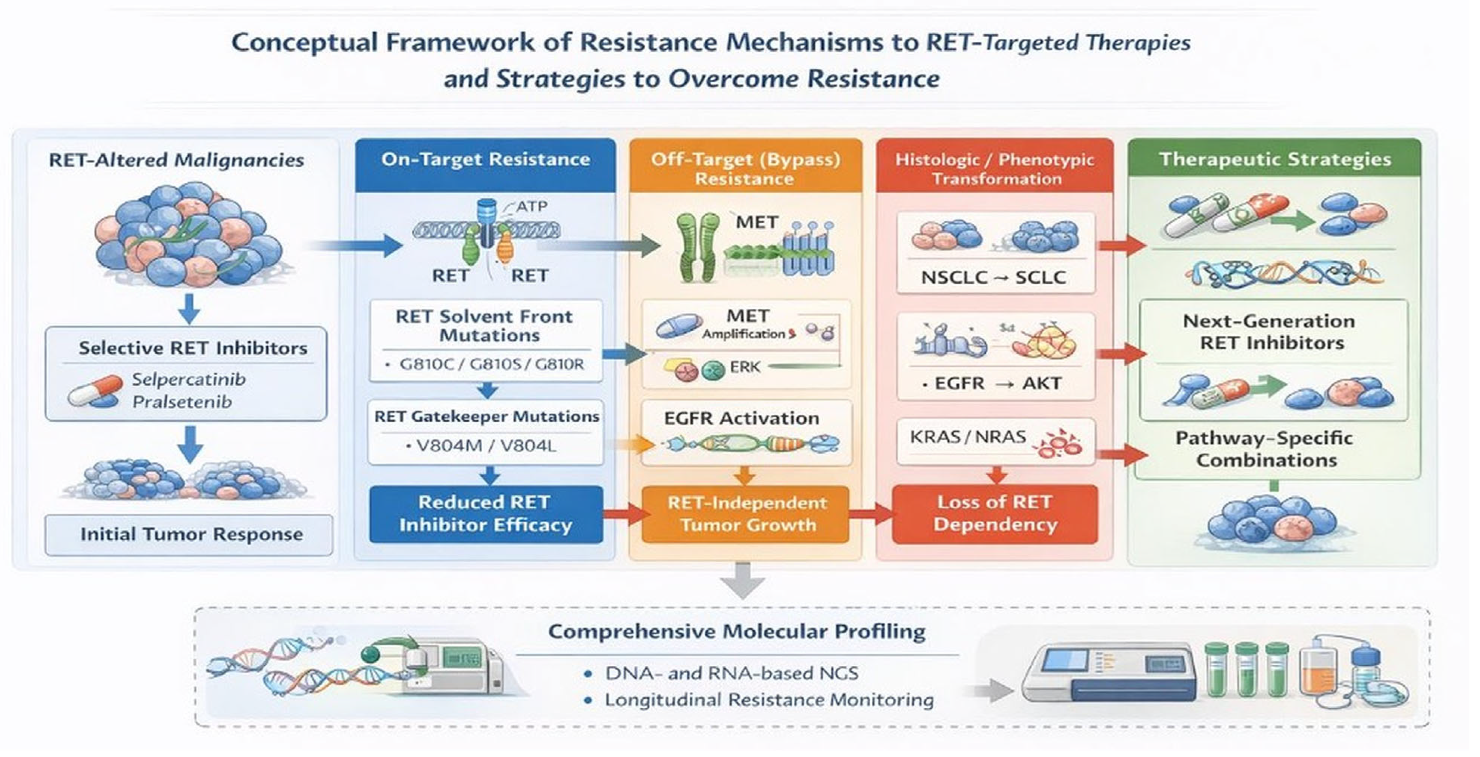 | Pralsetinib | Selective RET | RET only | 2020 | ORR 72% (TN) | HTN, Neutropenia |