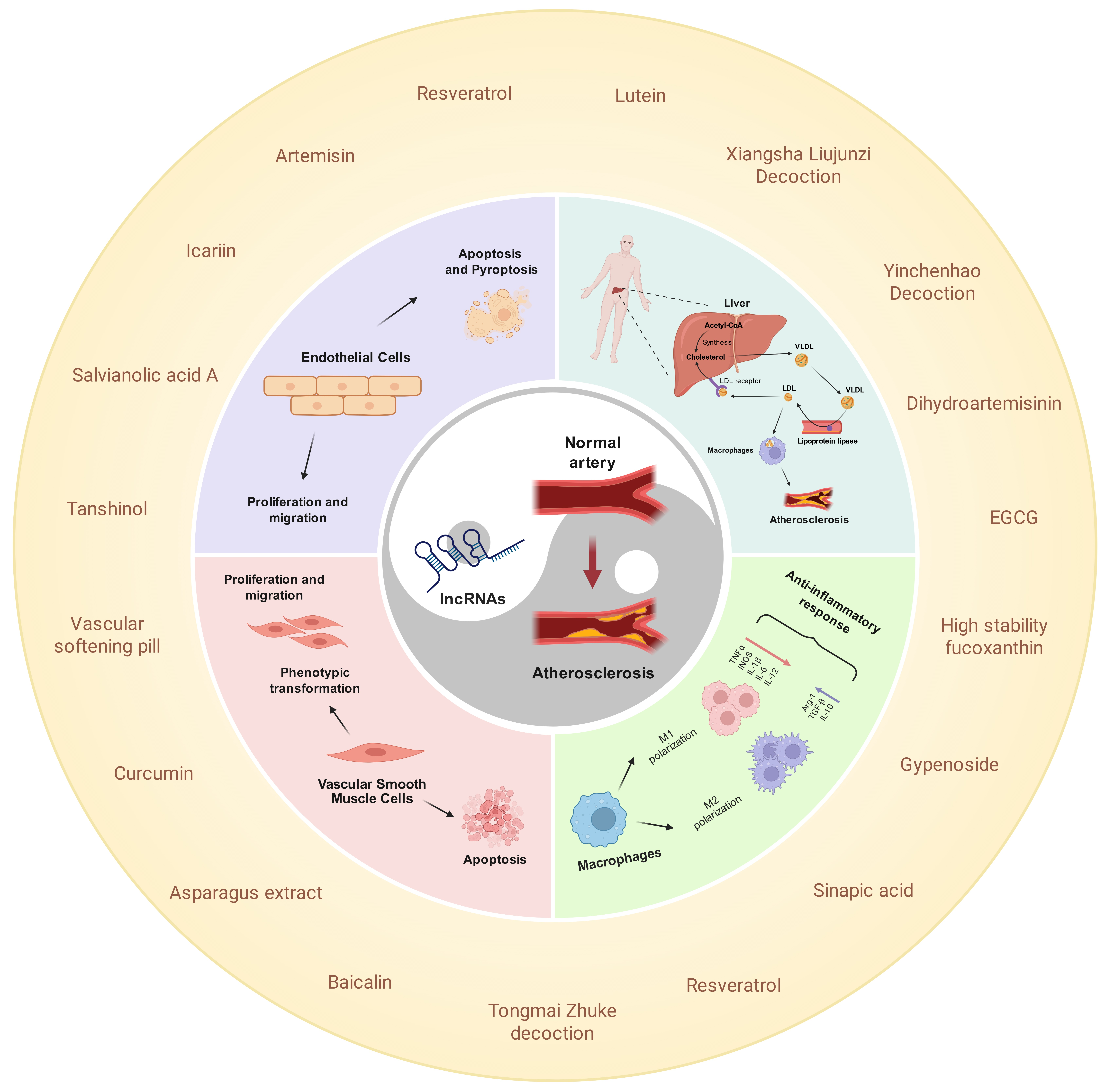 | Tanshinol | lncRNA TUG1 | ApoE−/− mice | Reduces lncRNA TUG1 and increases miR-26a to inhibit endothelial cell apoptosis and reduce AS lesions | [16] | |