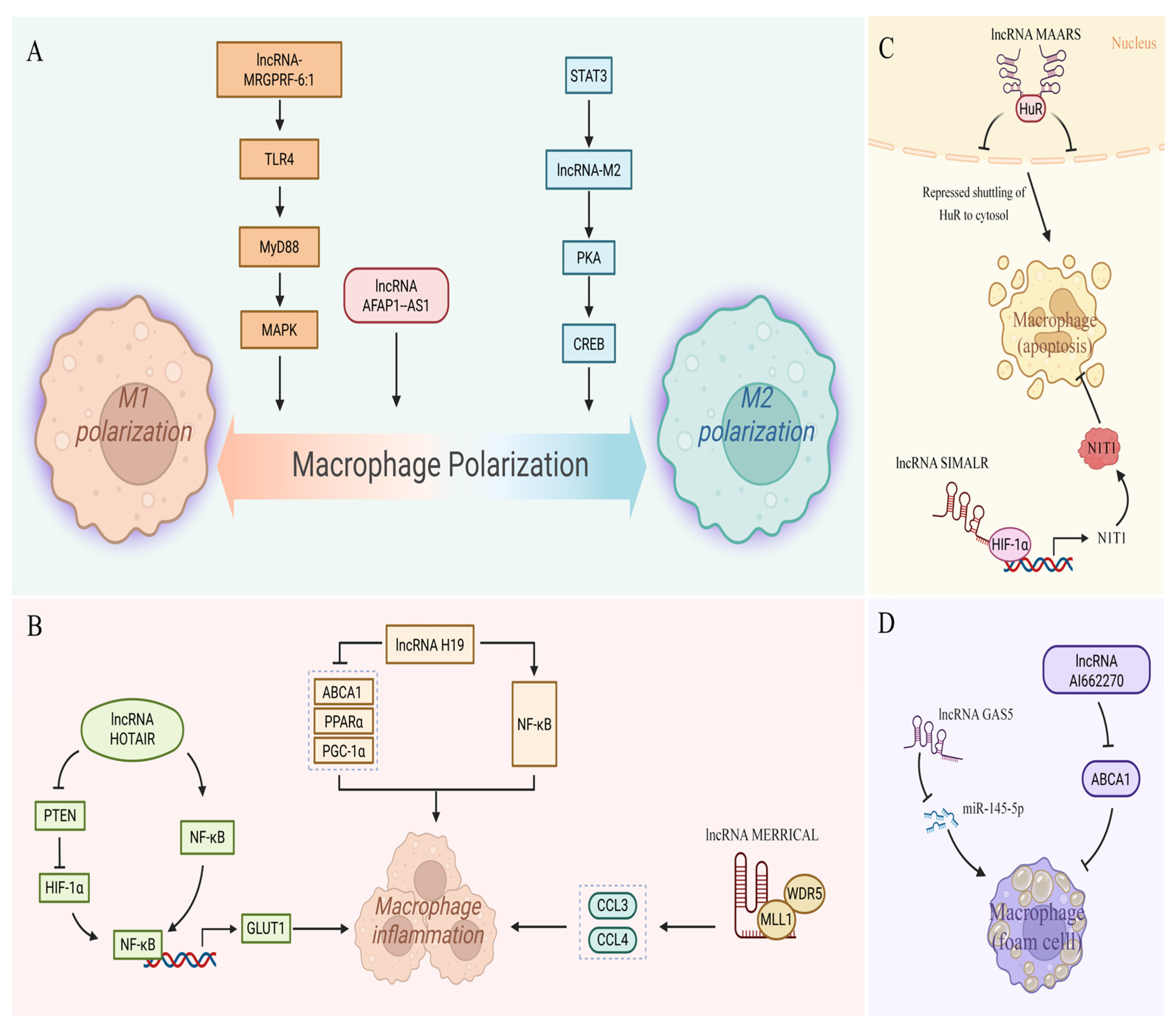 | Macrophage Polarization | lncRNA-M2 | --- | Macrophages | AS-specific (LPS-induced, M2 differentiation) | STAT3 enhances lncRNA-M2 transcription and histone modification, facilitating M2 differentiation via the PKA/CREB pathway | [106] |