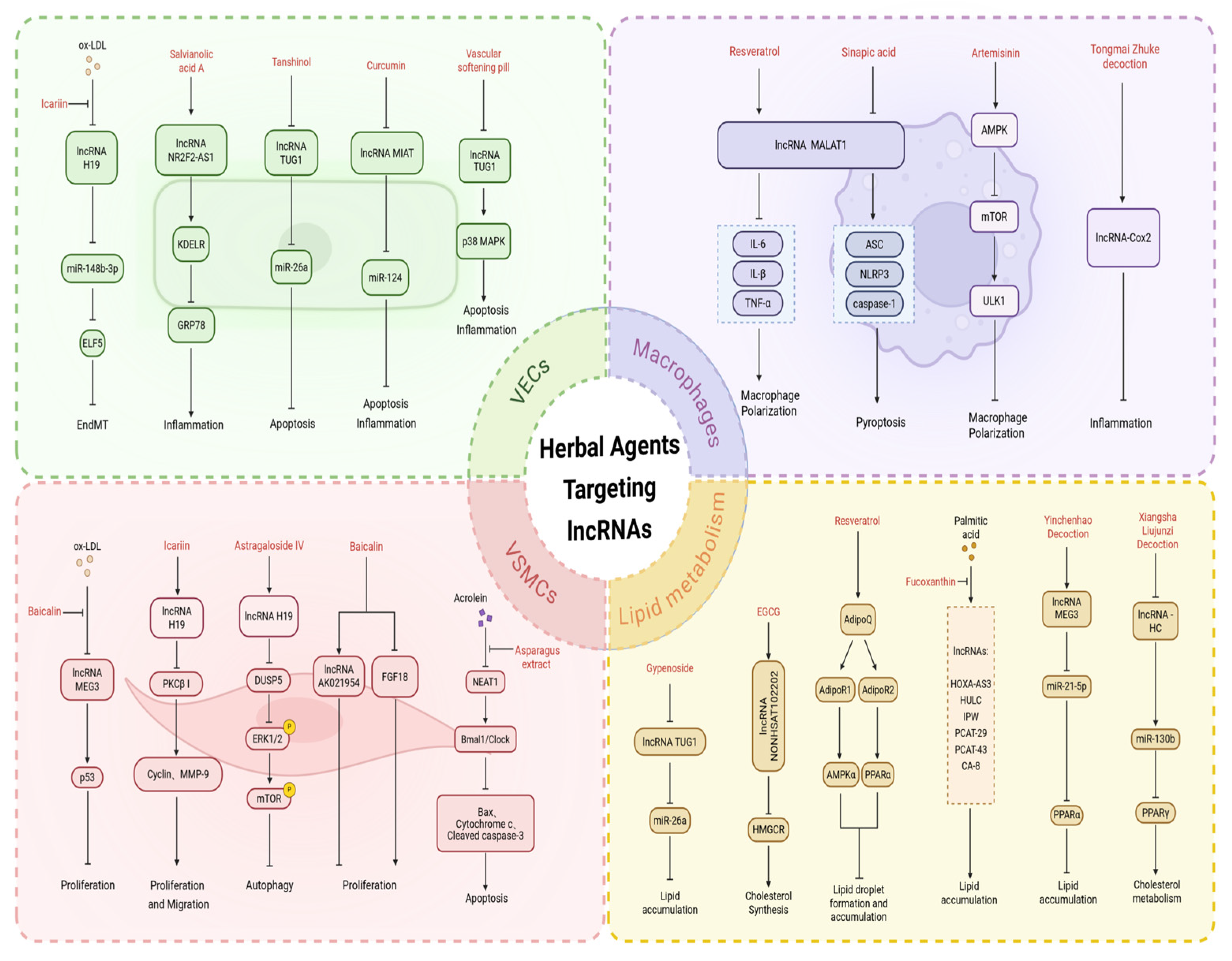 | Lipid Metabolism | Gypenosides | lncRNA TUG1 | ApoE−/− AS mice | Gypenosides may improve hepatic lipid deposition in ApoE−/− AS mice by influencing the lncRNA TUG1/miR-26a axis to interfere with the mitochondrial apoptosis pathway, thereby preventing/treating AS | [137] |