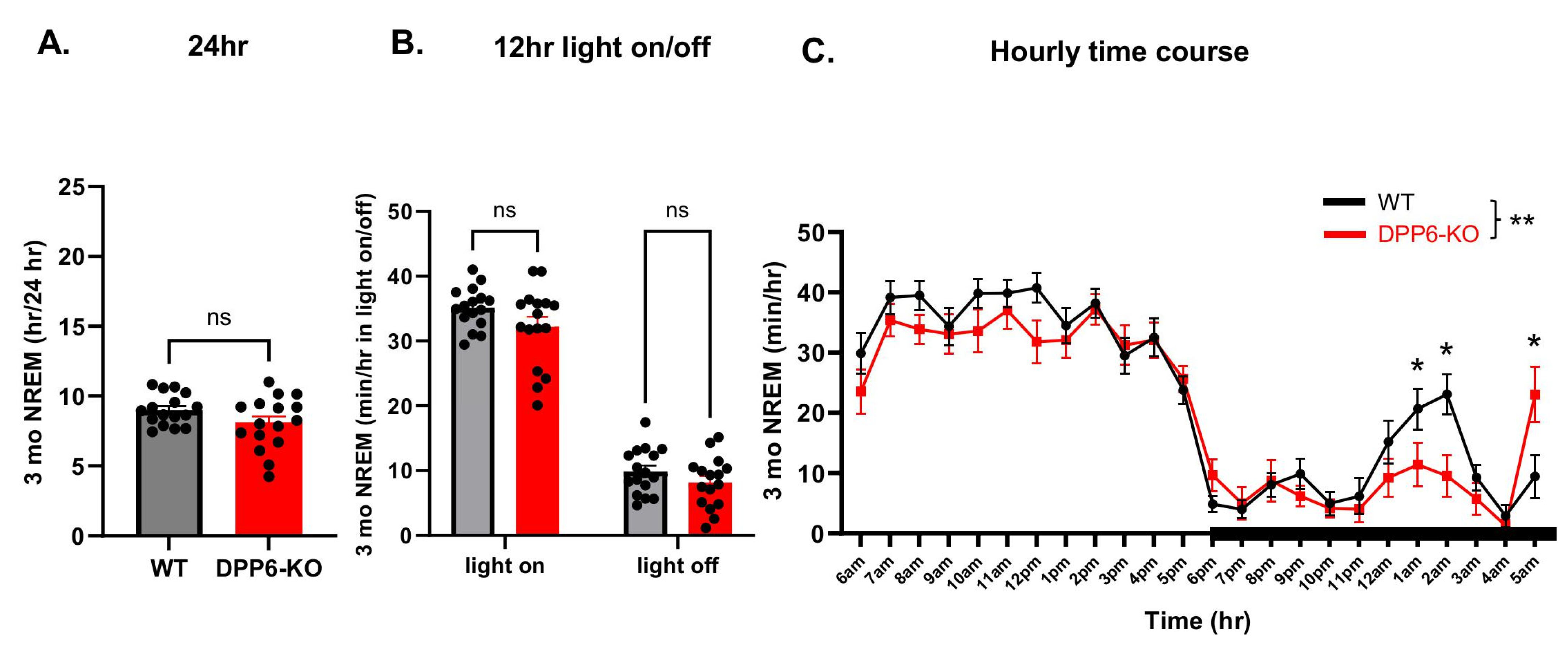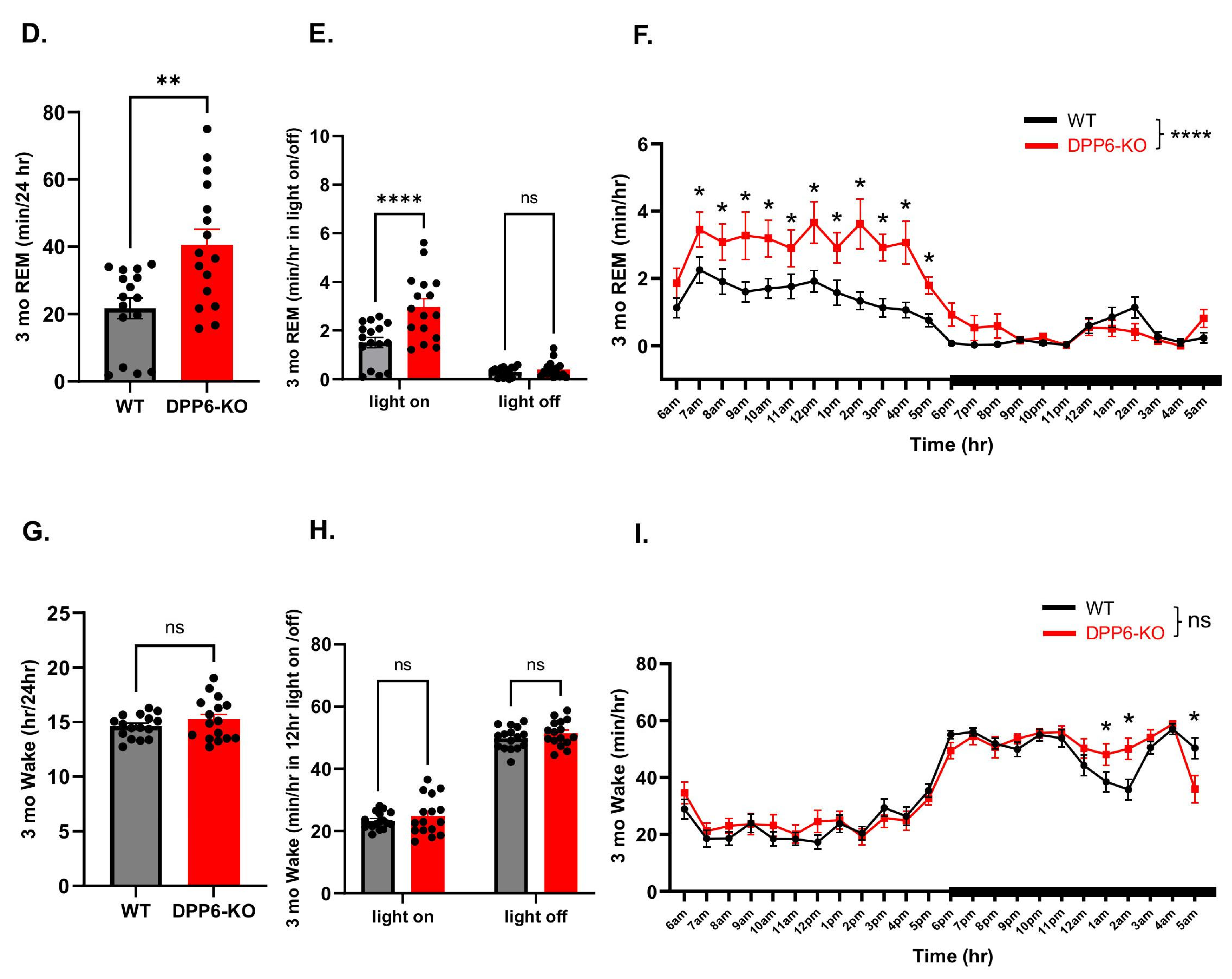 2.2. Three-Month-Old Adult DPP6-KO Mice Have Abnormal Sleep with Increased REM