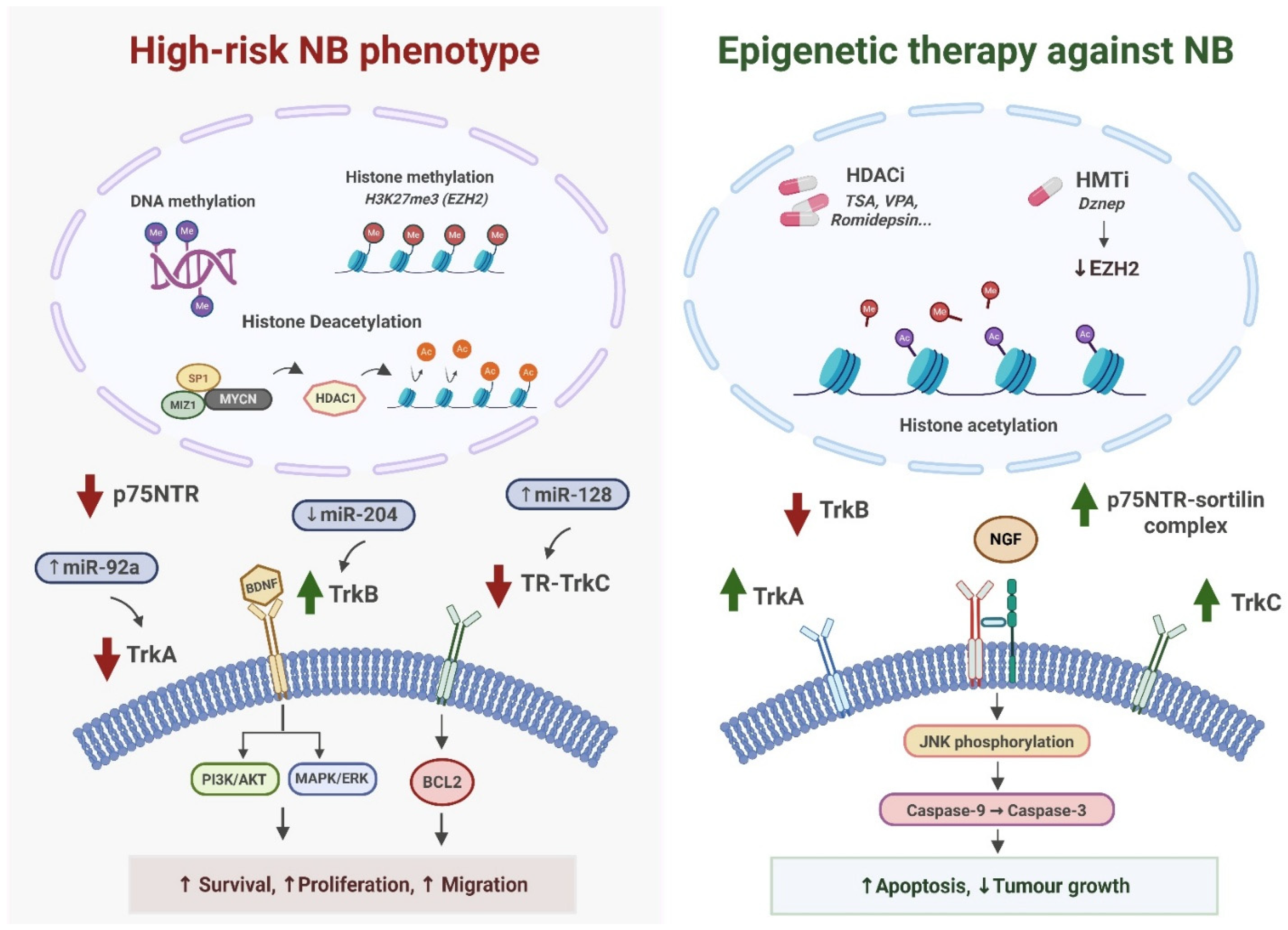 | HDAC inhibitors | Chromatin relaxation | ↓ TrkB; ↑ p75NTR and TrkC | Apoptosis sensitisation; MES attenuation | [28,36,48,49] |