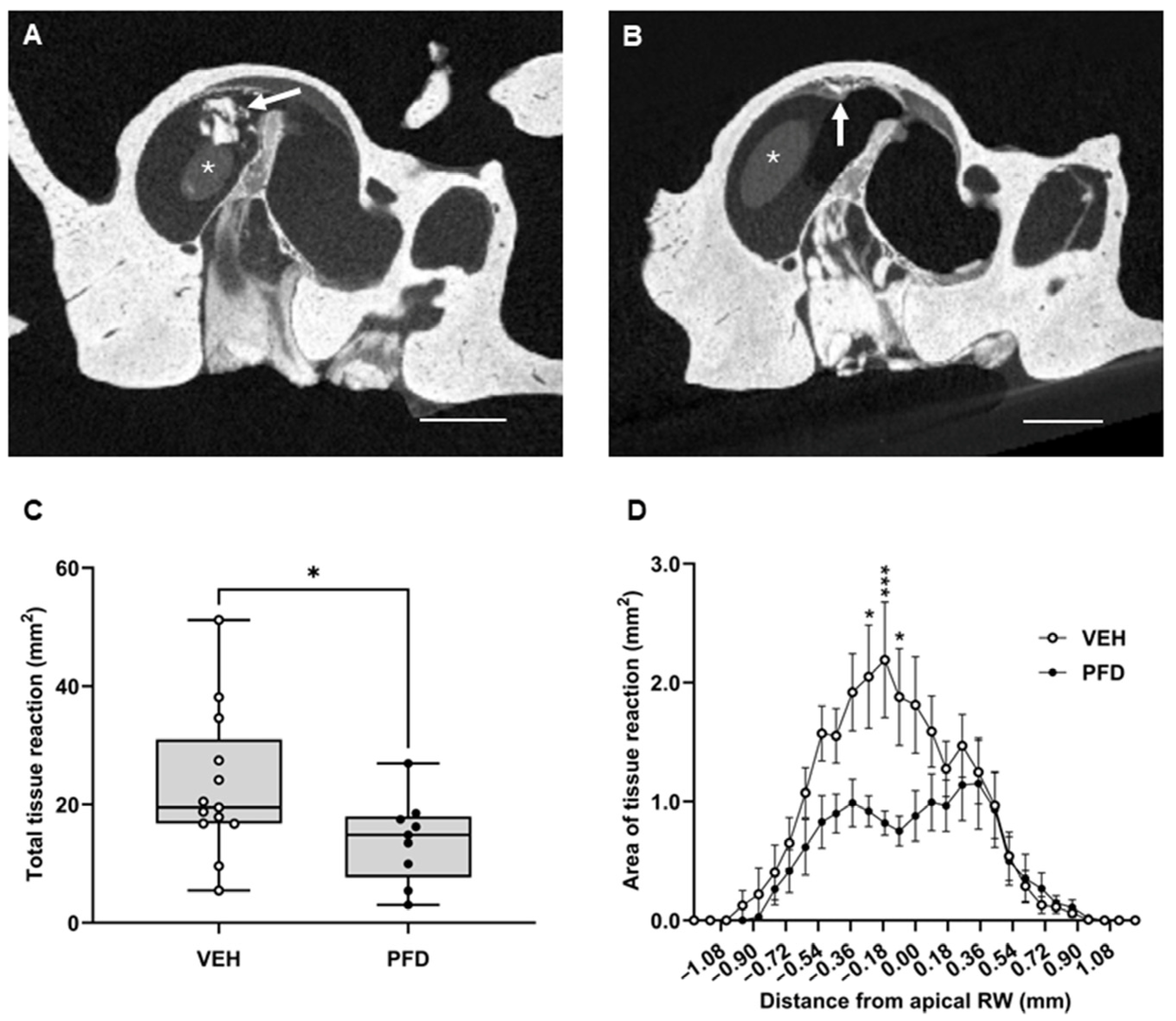 2.5. PFD Treatment Significantly Reduced Intracochlear Fibrosis and Neo-Ossification in a Guinea Pig Model of Implantation
