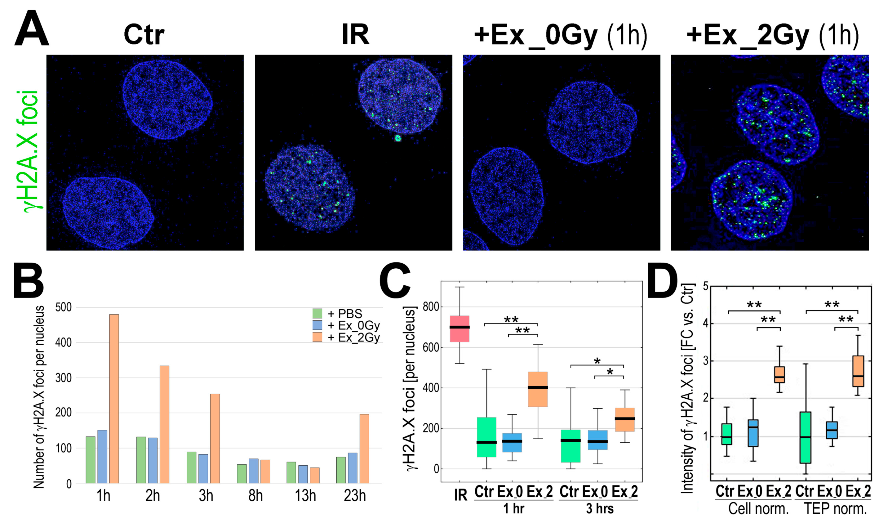 - Smolarz, M.; Skoczylas, Ł.; Gawin, M.; Krzyżowska, M.; Pietrowska, M.; Widłak, P. Radiation-Induced Bystander Effect Mediated by Exosomes Involves the Replication Stress in Recipient Cells. Int. J. Mol. Sci. 2022, 23, 4169. [Google Scholar] [CrossRef] [PubMed]