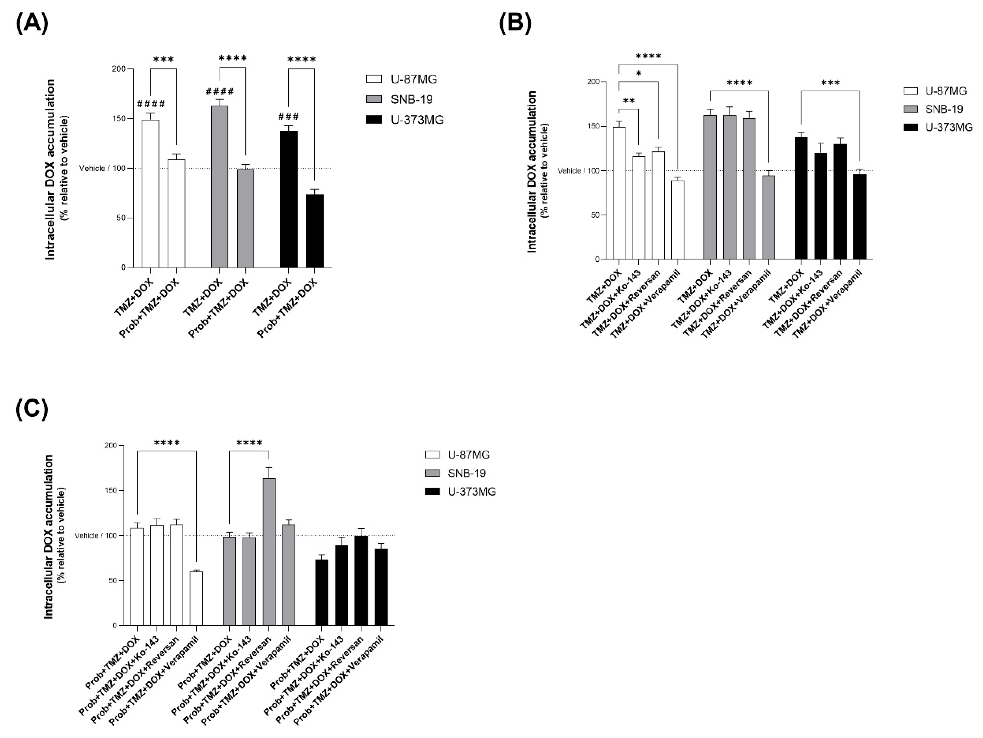 2.4. TMZ Induces Intracellular DOX Accumulation in Glioblastoma Cells