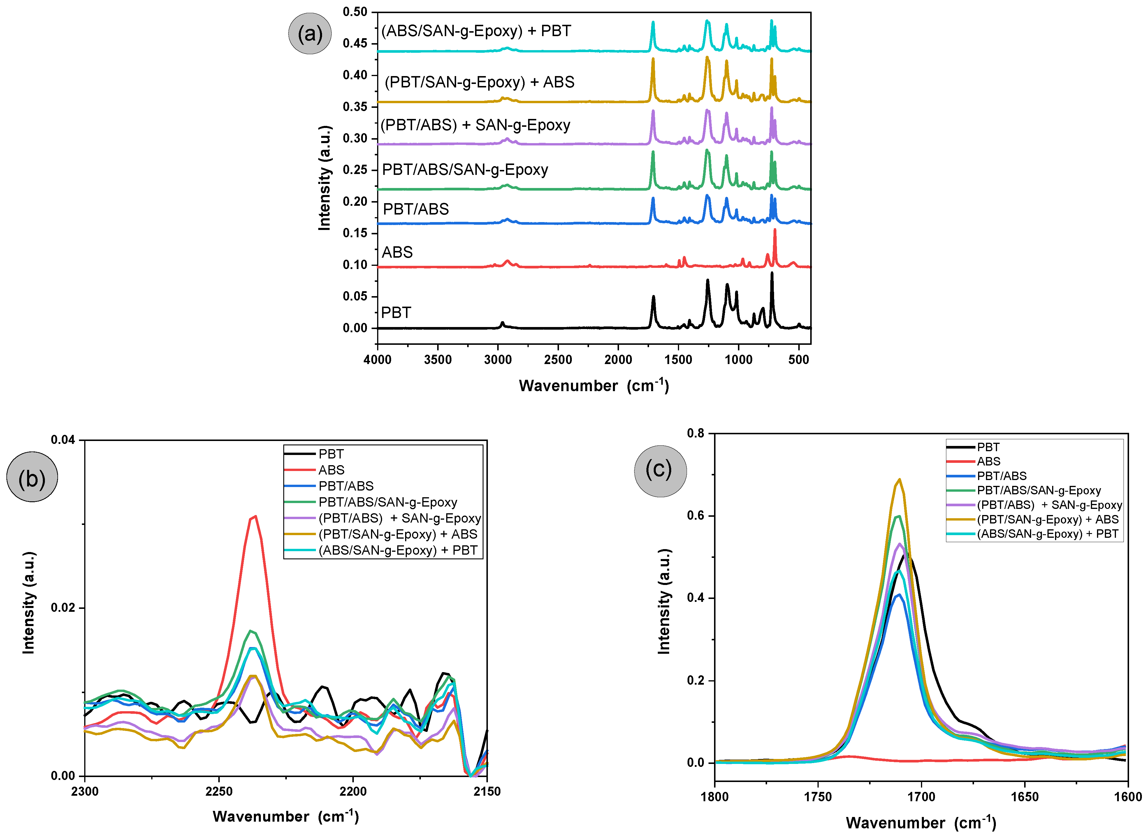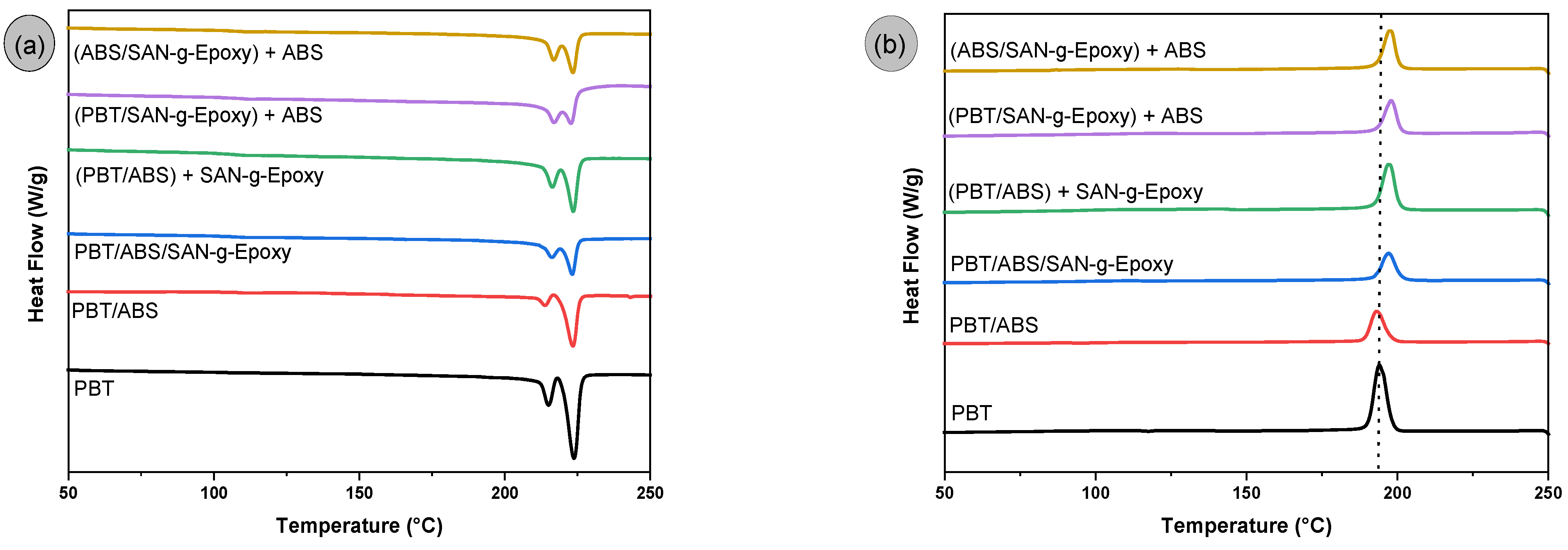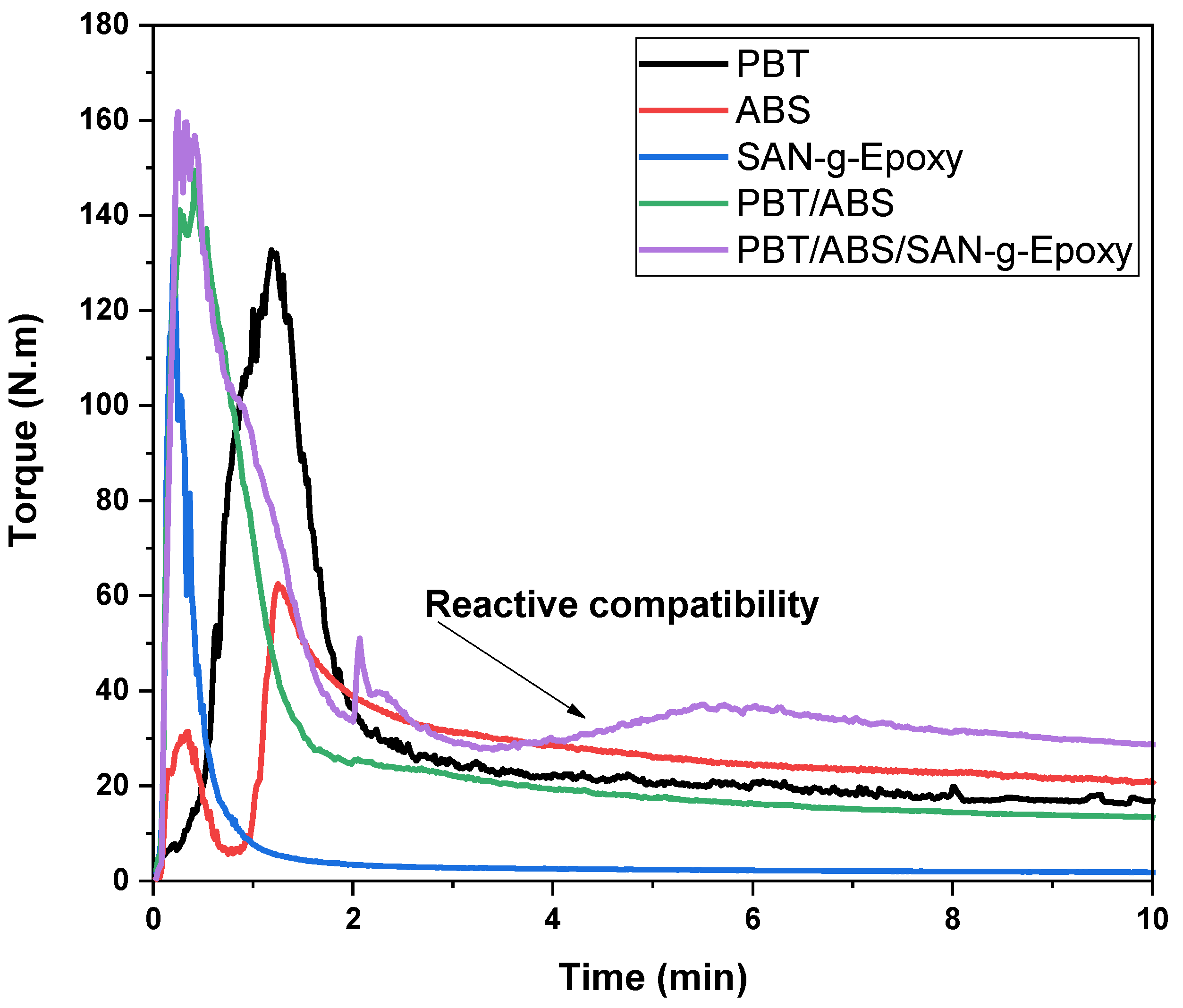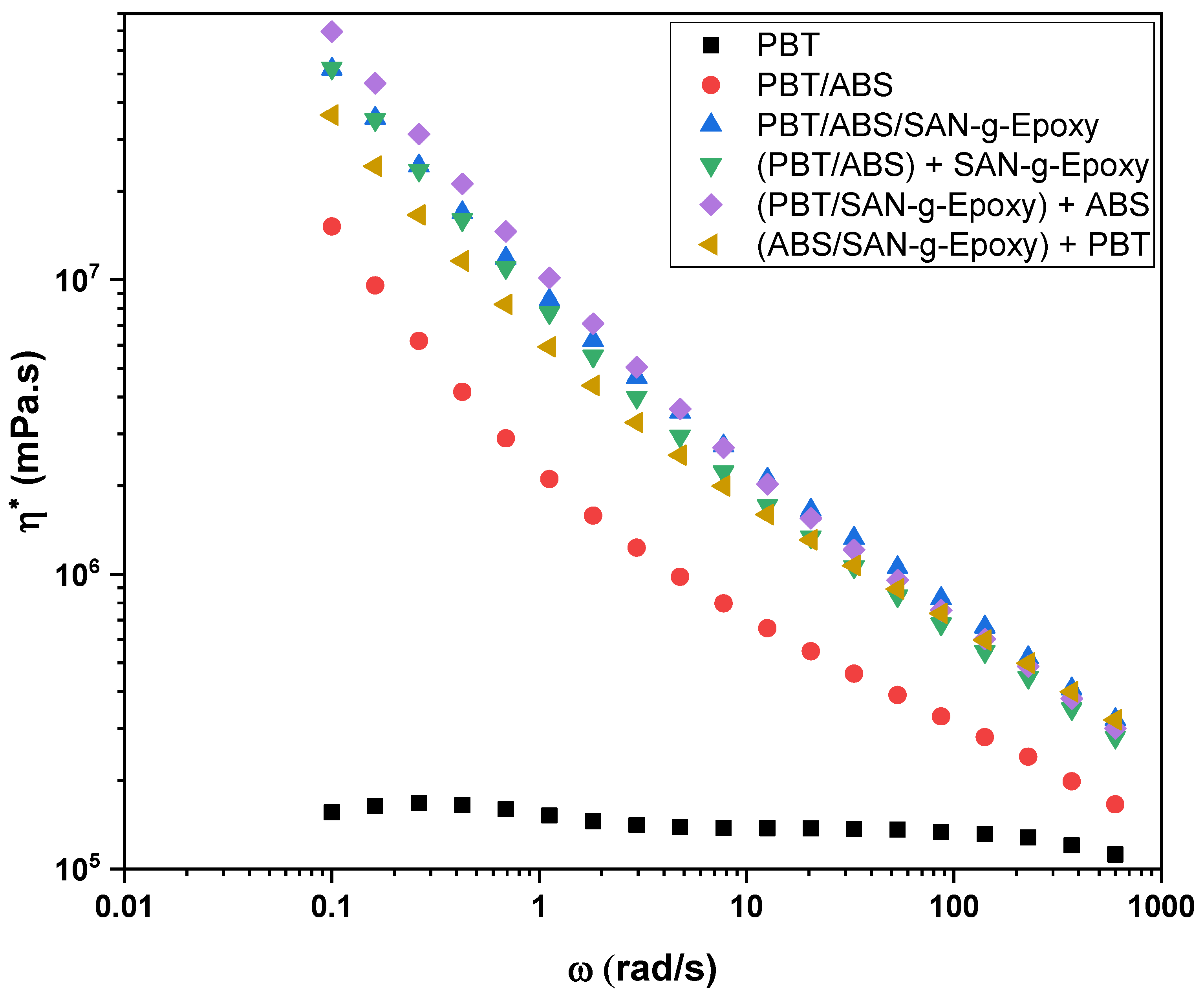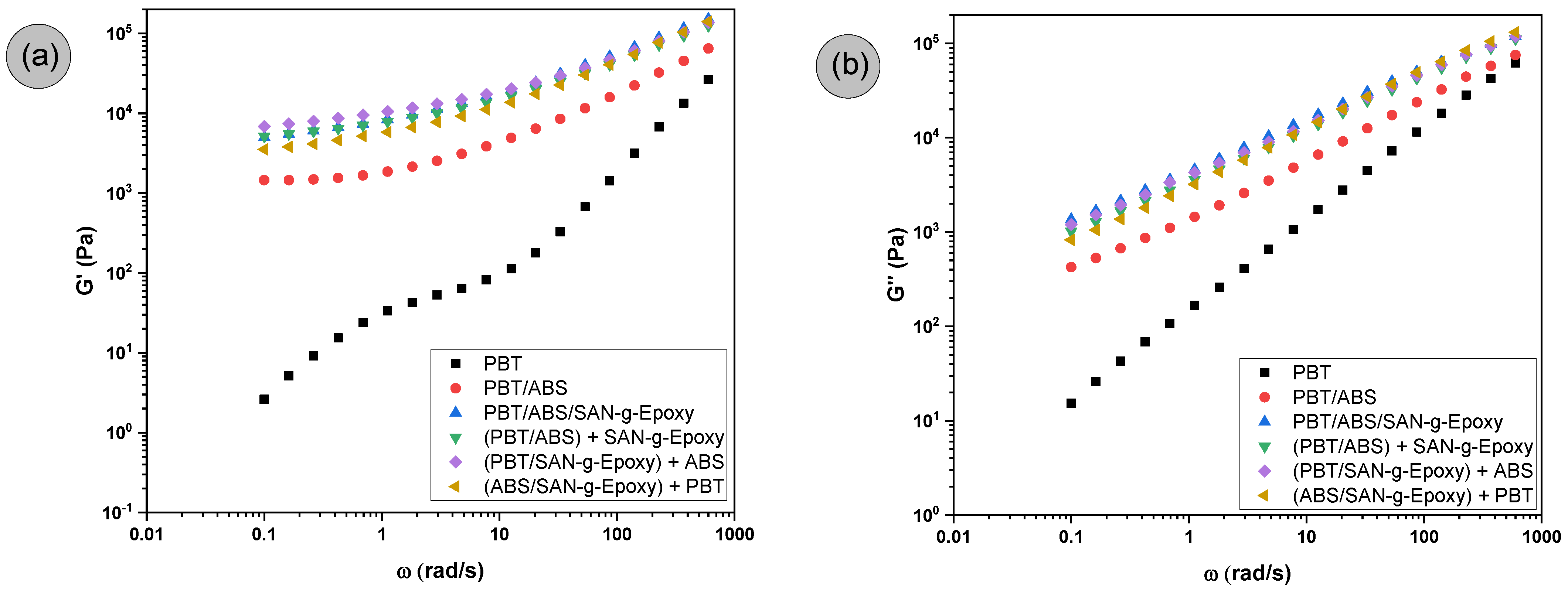 - (ABS/SAN-g-Epoxy) + PBT: Indicates that, initially, ABS was processed together with the SAN-g-epoxy compatibilizer in a first extrusion step, forming a pre-blend. Subsequently, this material was reprocessed in a second step, in which PBT was incorporated into the mixture.