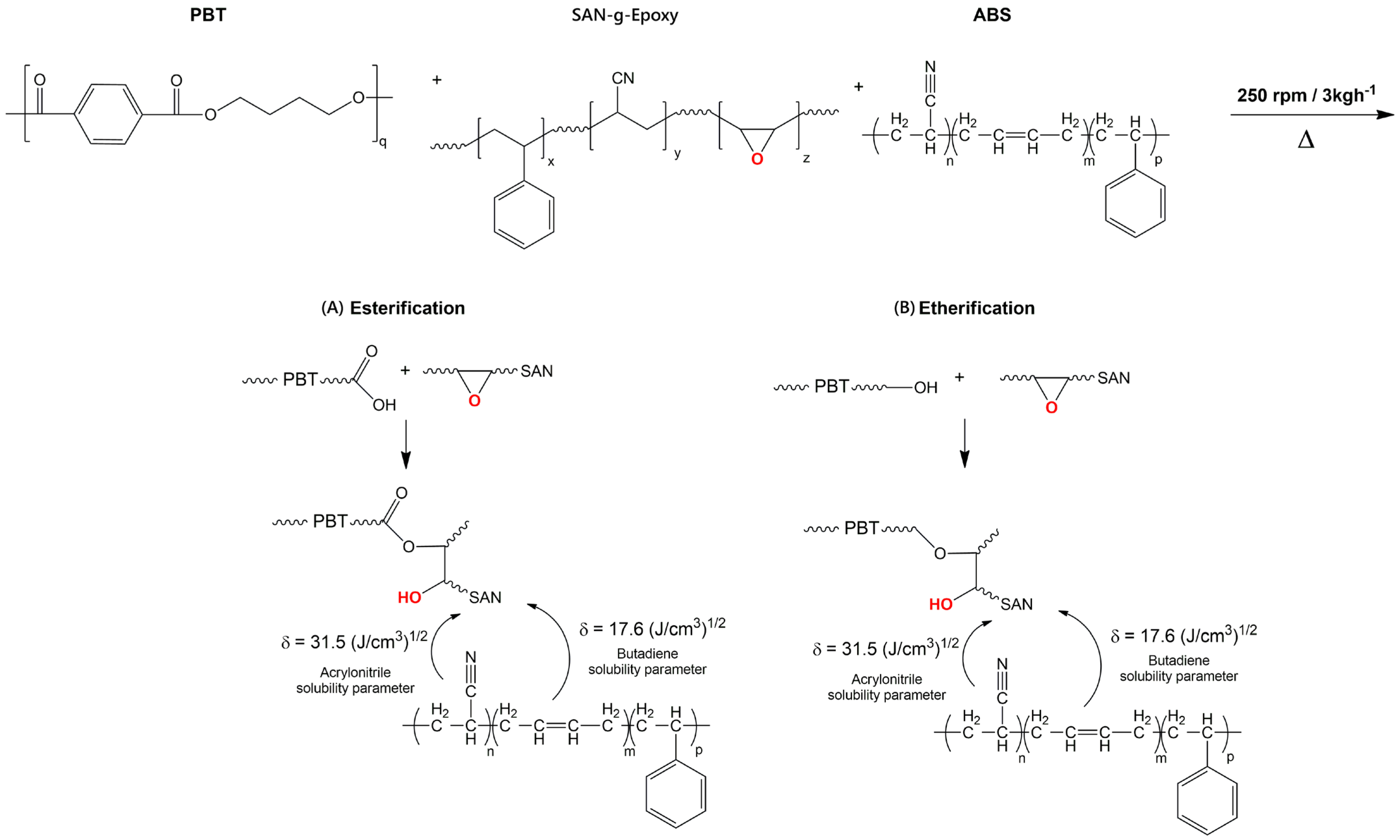 - Hale, W.; Keskkula, H.; Paul, D.R. Compatibilization of PBT/ABS blends by methyl methacrylate-glycidyl methacrylate-ethyl acrylate terpolymers. Polymer 1999, 40, 365–377. [Google Scholar] [CrossRef]