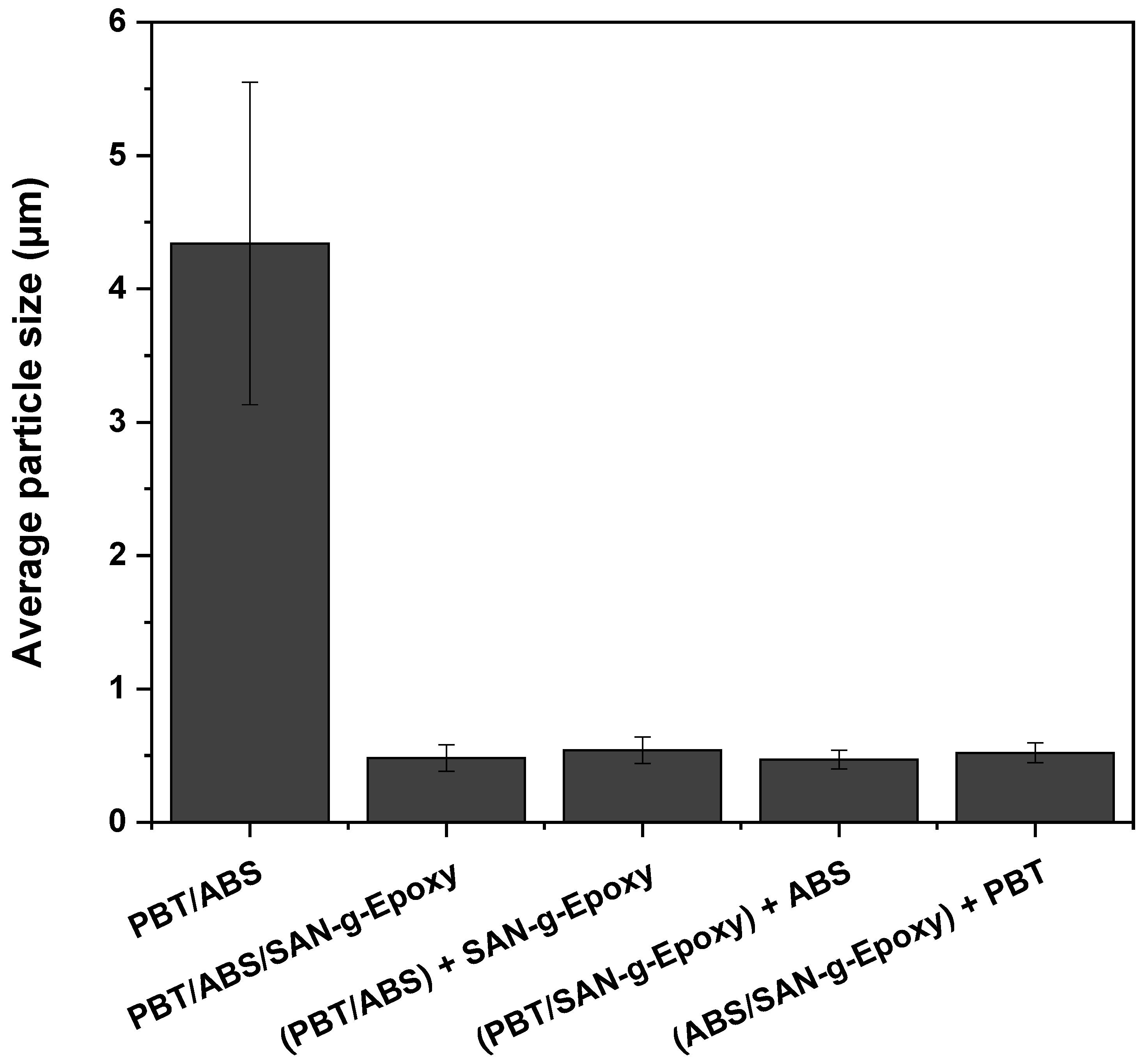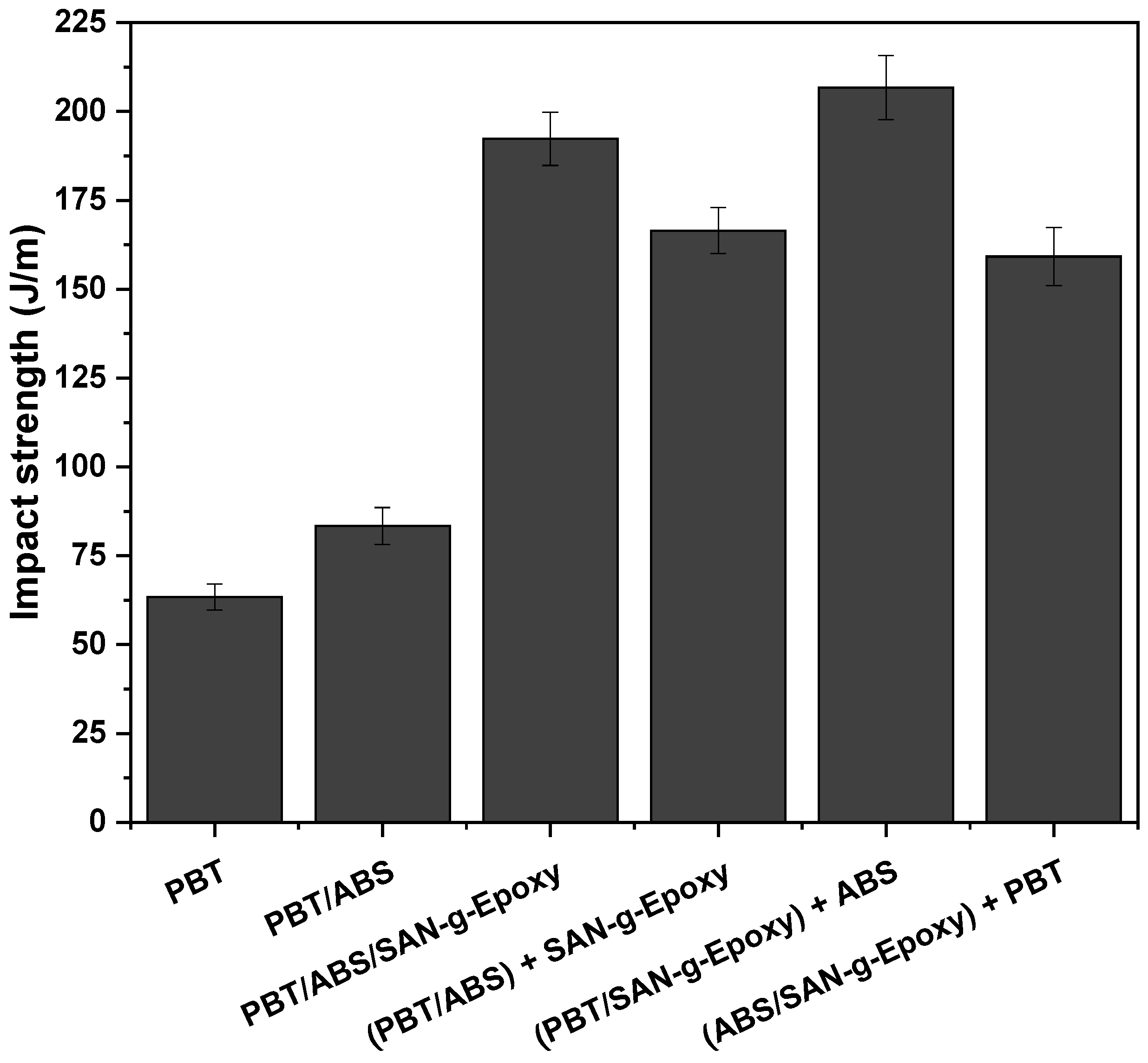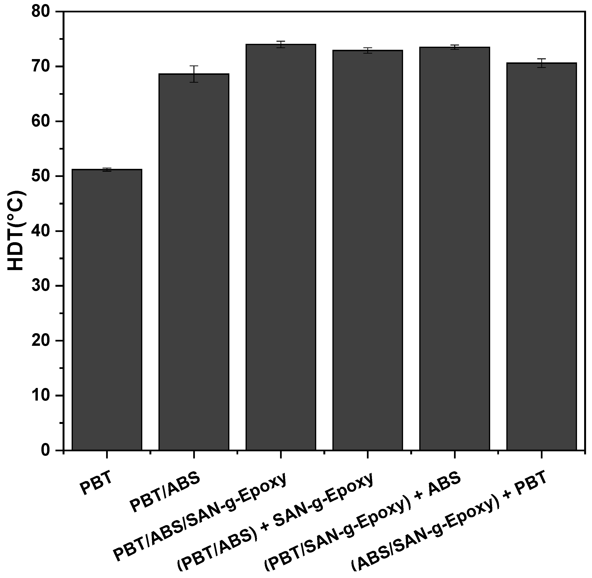 | (ABS/SAN-g-Epoxy) + PBT | 1172.3 ± 15.2 | 61.9 ± 0.2 | 112.8 ± 1.1 |