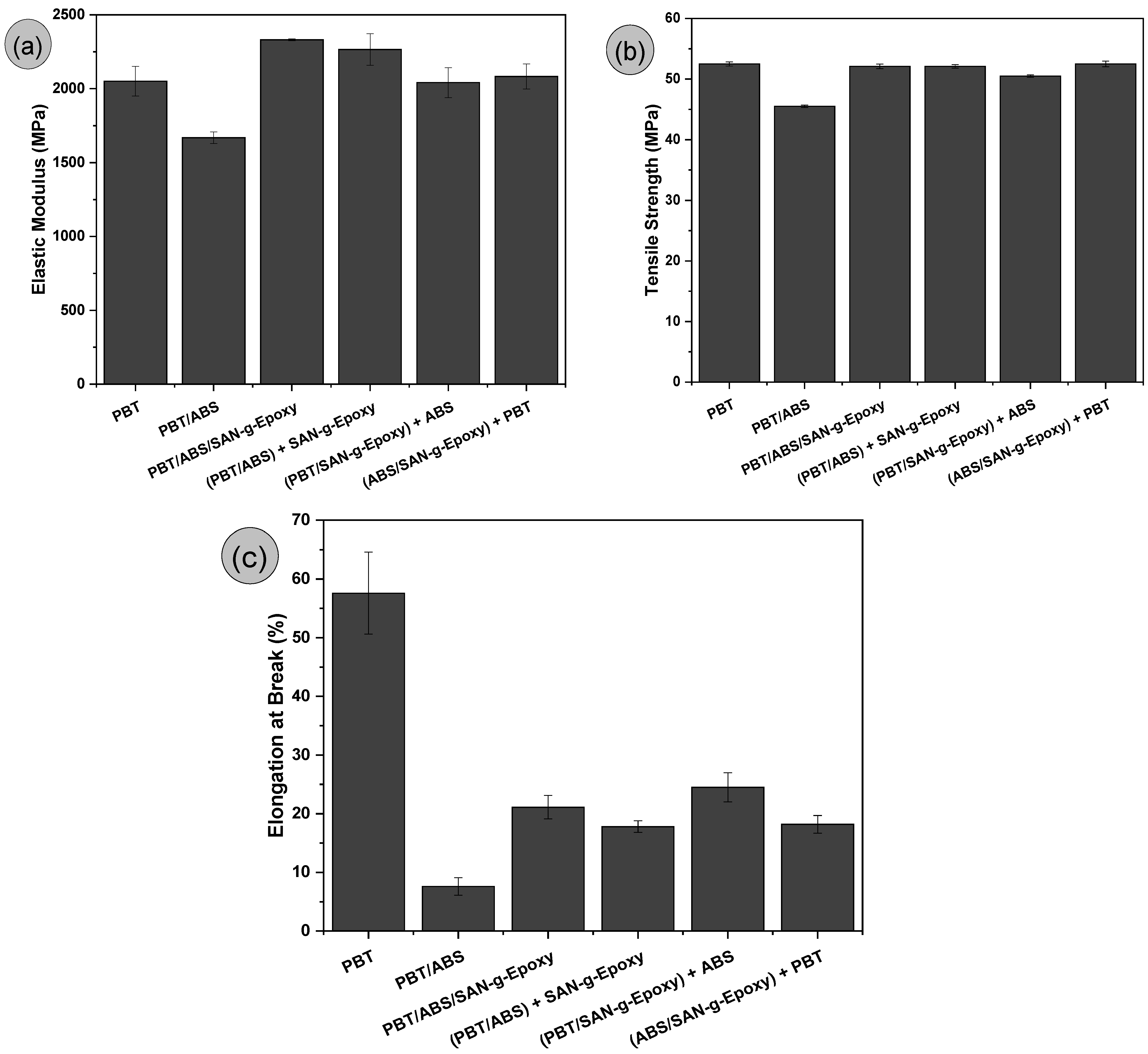 | (PBT/ABS) + SAN-g-Epoxy | 1189.2 ± 20.2 | 62.6 ± 0.2 | 112.8 ± 1.4 |