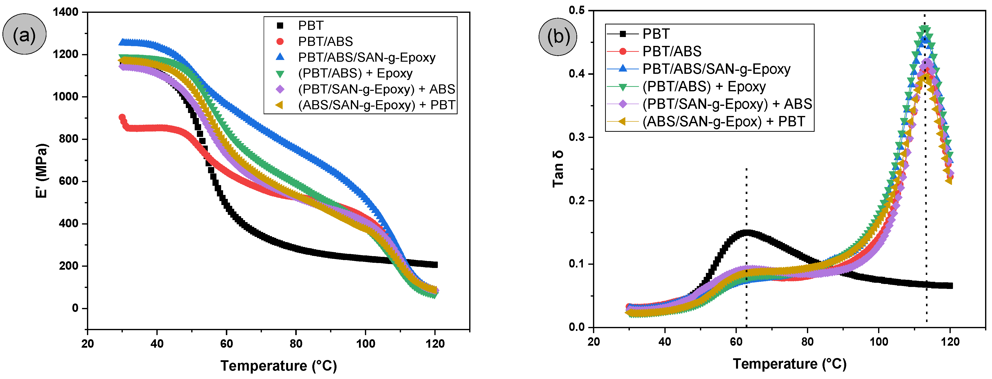 | Samples | E′ (MPa) (30 °C) | TgPBT (°C) | TgABS (°C) |