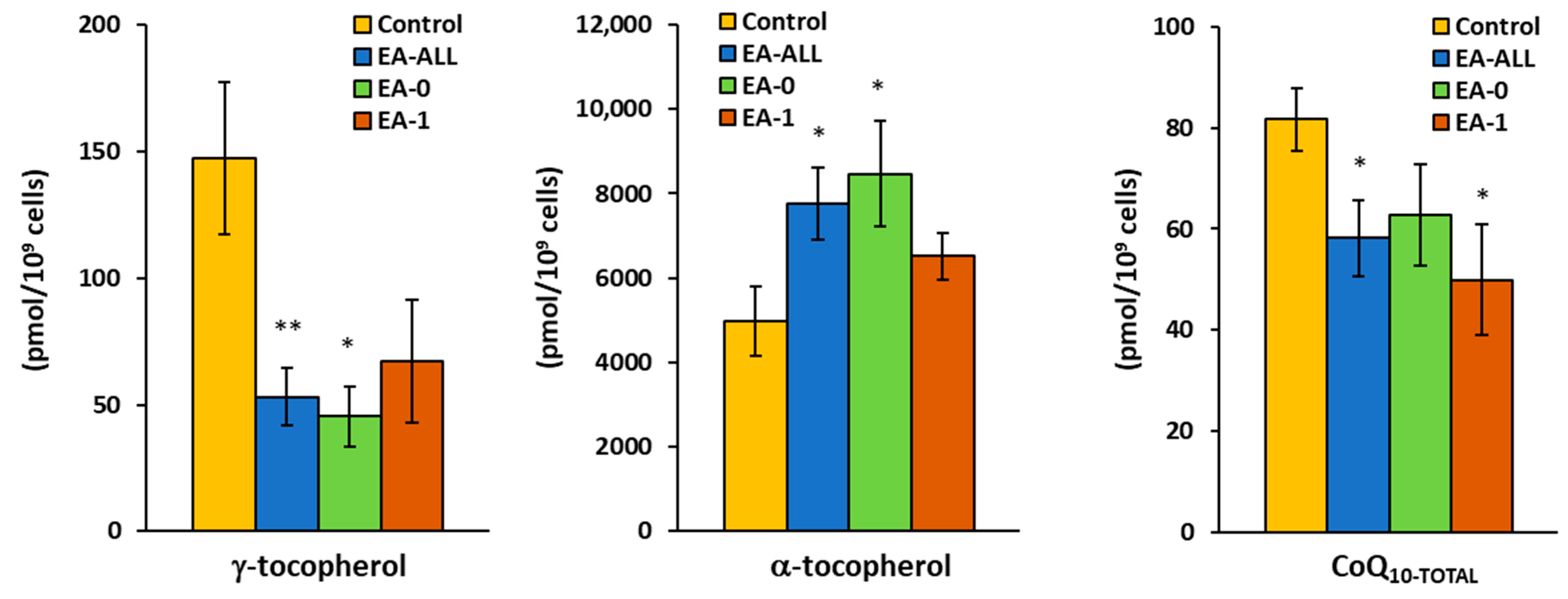 - Lang, J.K.; Gohil, K.; Packer, L. Simultaneous determination of tocopherols, ubiquinols, and ubiquinones in blood, plasma, tissue homogenates, and subcellular fractions. Anal. Biochem. 1986, 157, 106–116. [Google Scholar] [CrossRef]