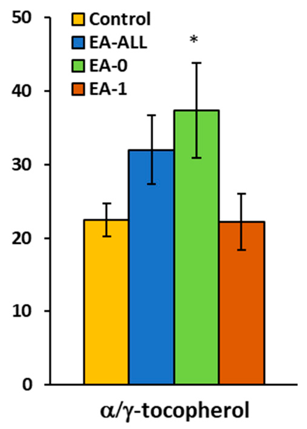 | α-Toc/γ-Toc | Mean ± SEM | 25.70 ± 2.30 | 32.00 ± 4.70 | 37.40 ± 6.50 | 22.20 ± 3.8 |